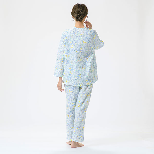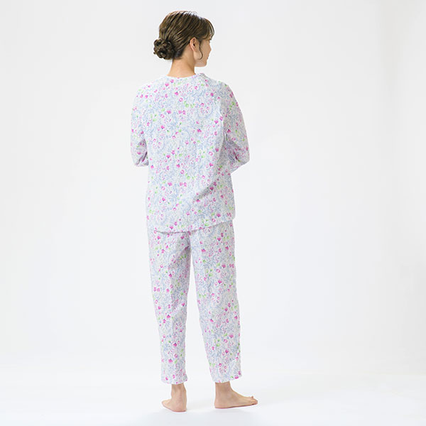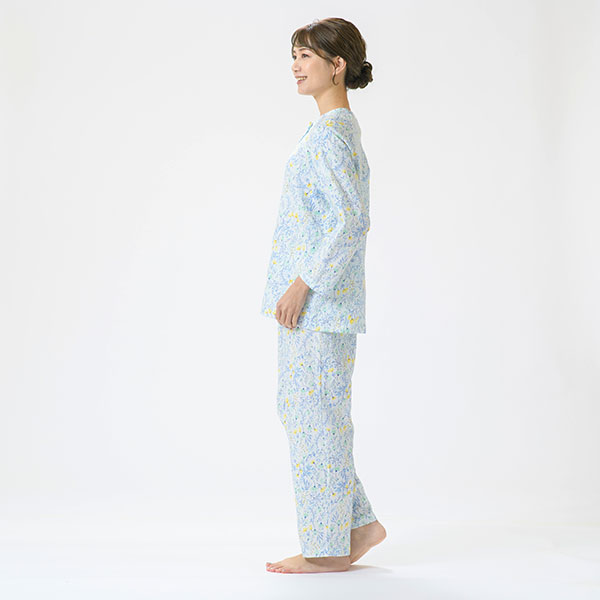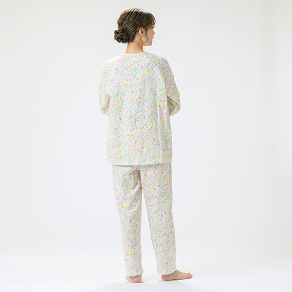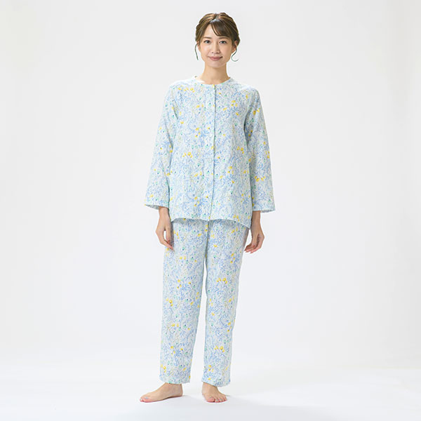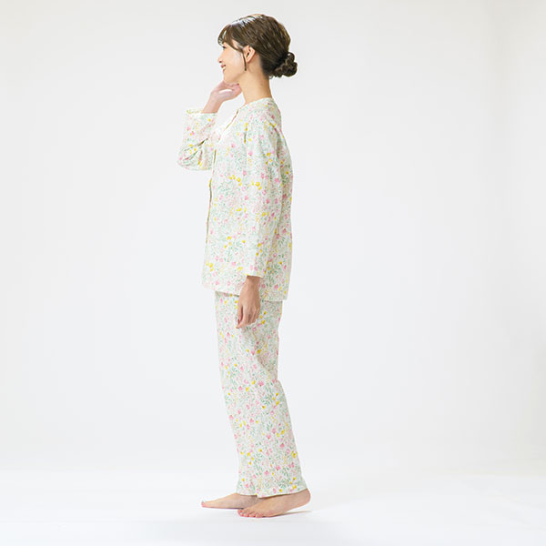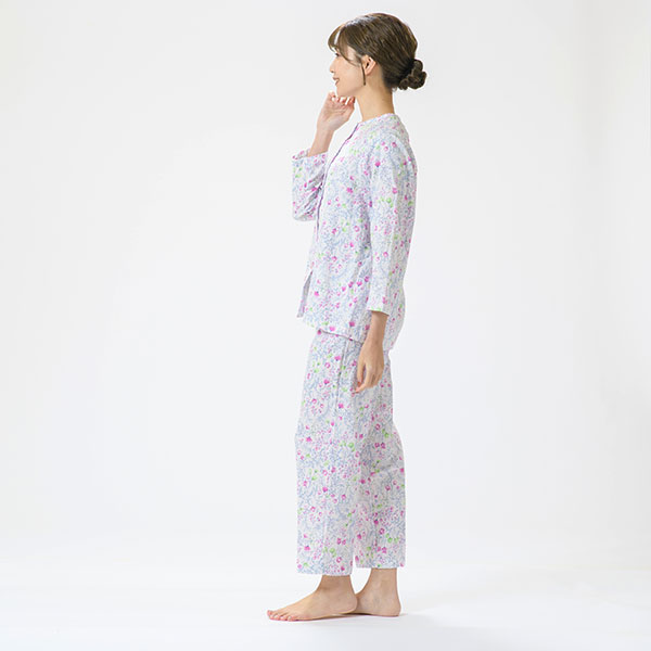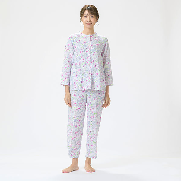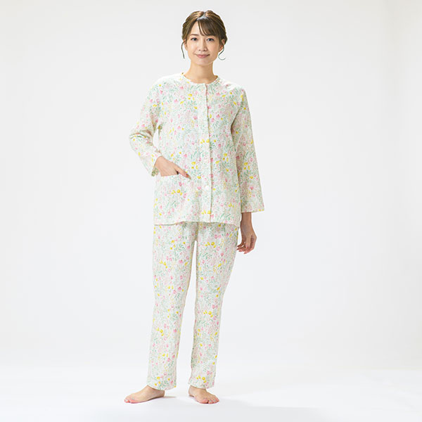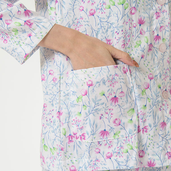 上品な花柄の綿100%二重ガーゼパジャマです。色とりどりの花柄プリントが上品に映える爽やかなデザインで、派手すぎず、程よい華やかさで心地よい印象に仕上げました。 ラグラン袖は腕を動かしやすいデザインです。 上着に腰ポケットを付けているので、ちょっとした小物入れに便利です。素材はパジャマに最適な二重ガーゼ。 甘撚りの糸で薄く粗く平織りした綿織物で、その柔らかさがやさしく体を包み、快適な睡眠を促してくれます。 ガーゼ独特の軽くてサラッとした肌触りや、優れた吸湿性・放湿性も魅力のひとつです。