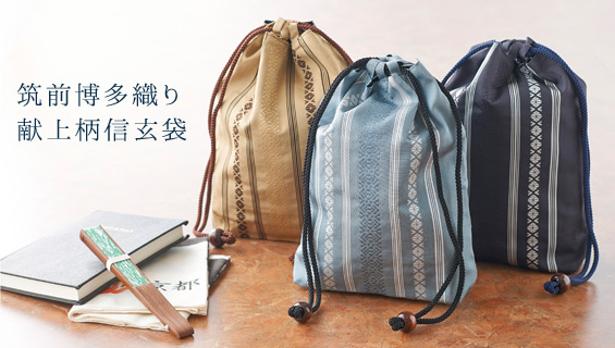 信玄袋とは、口を紐で締めくくる布製の手提げ袋のことで「合財袋(がつざいふくろ)」とも言い、明治30年代に大流行しました。明治時代は、厚紙を底に敷き、現在の旅行バッグのように服や道具を入れて持ち歩く大きいタイプと、携帯する小さいサイズがあったようです。近年は、男性が和服を着用したときに、小物や財布を入れる手提げ袋として活躍しています。