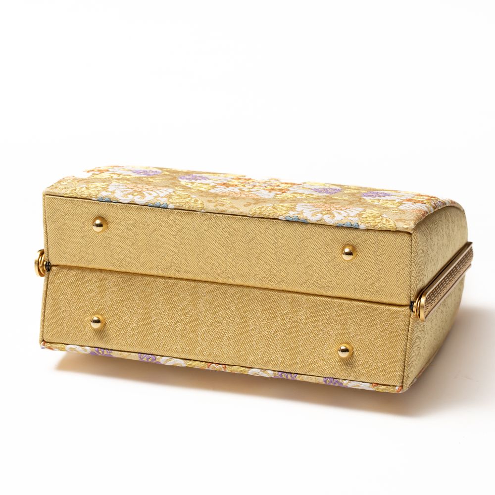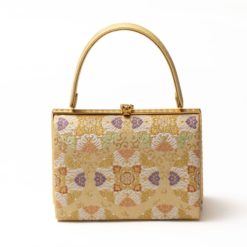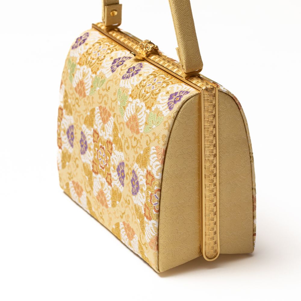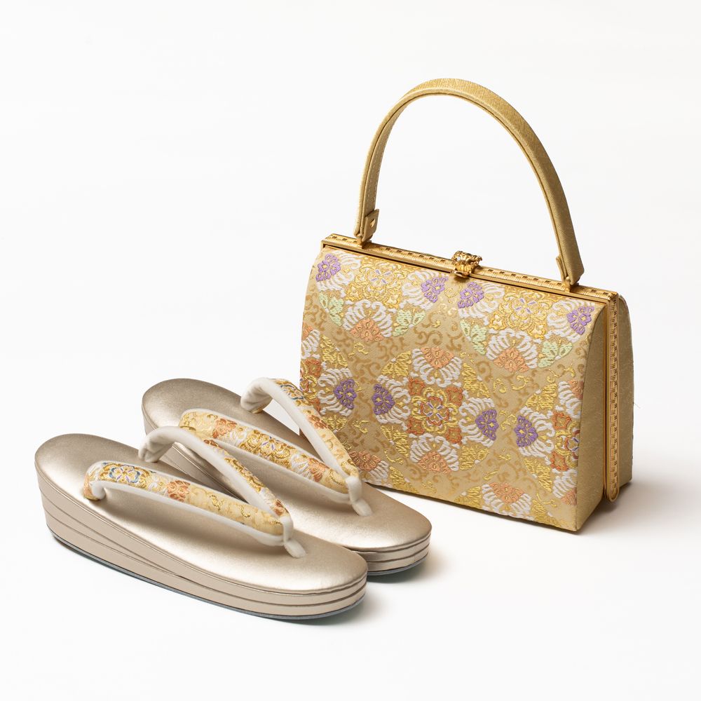●素材:【草履】鼻緒:絹100%(金属糸使用)/台:本革 【バッグ】本体:絹100%(金属糸使用)/口金:真鍮