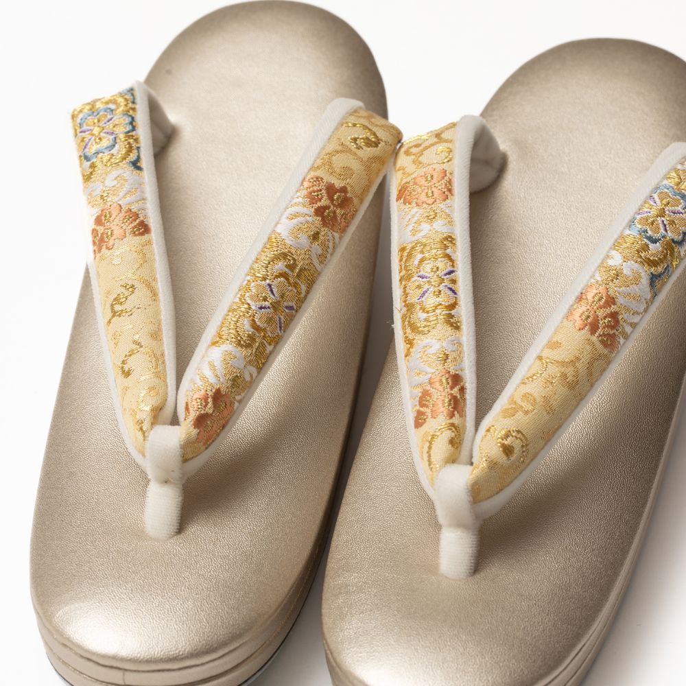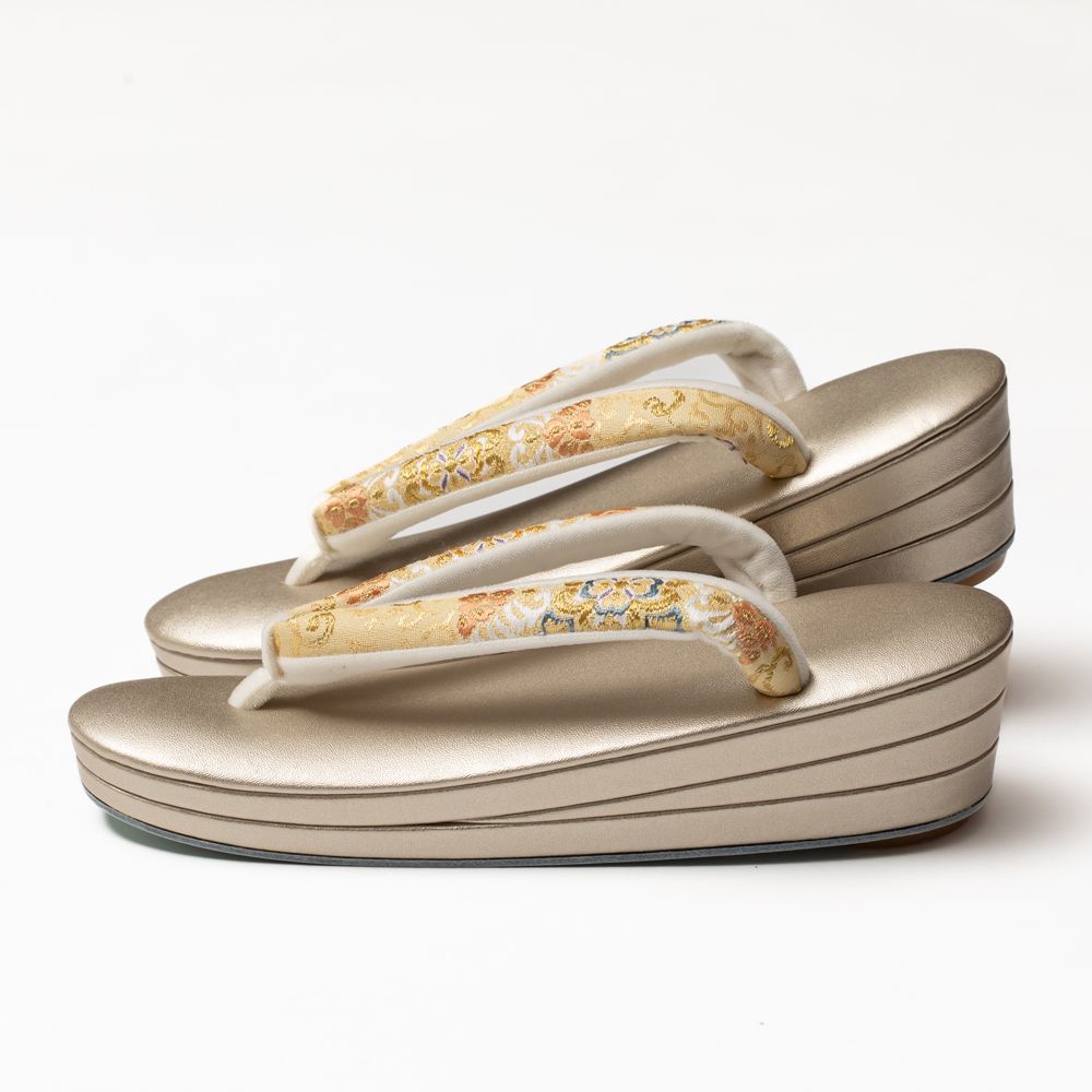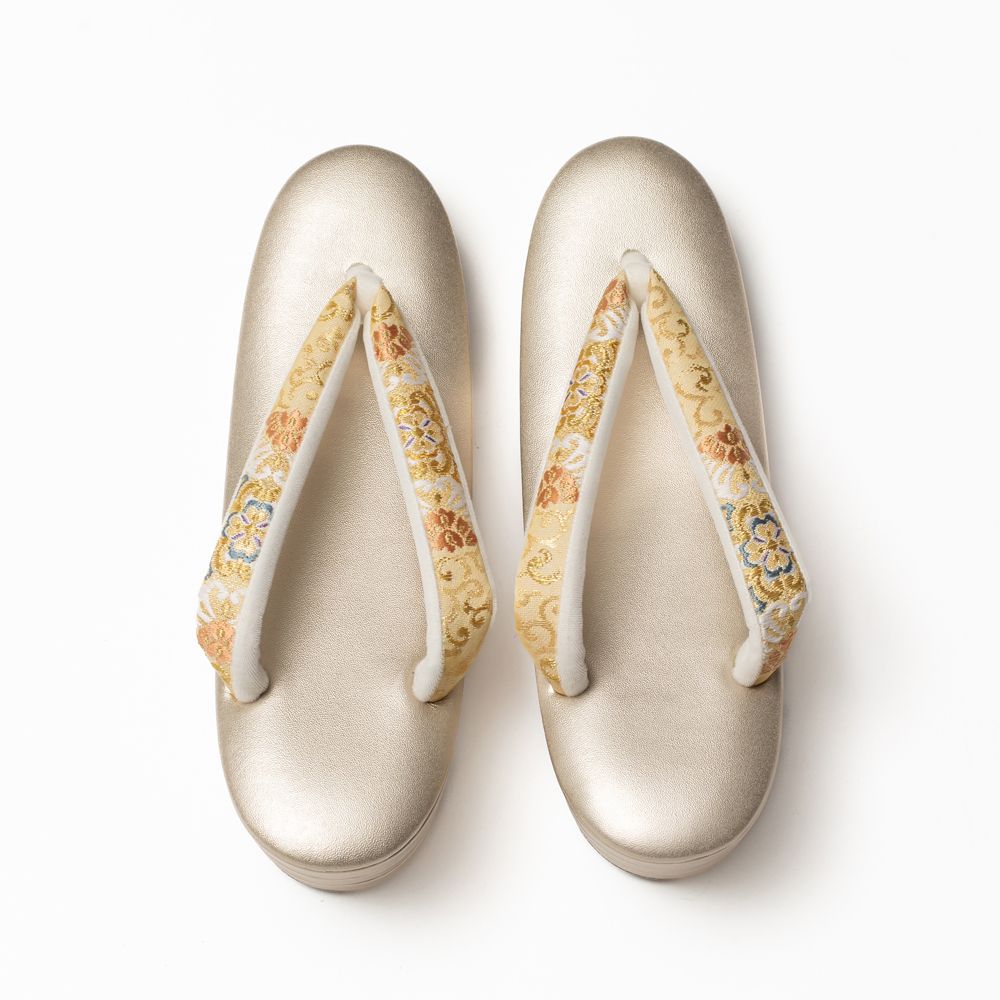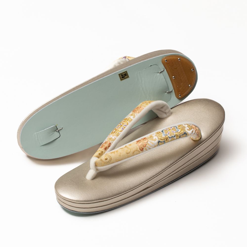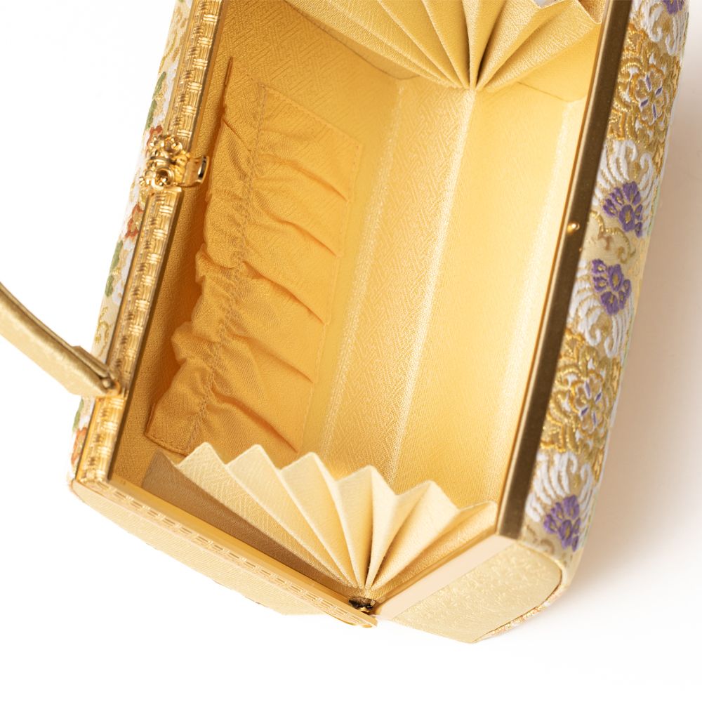●素材:【草履】鼻緒:絹100%(金属糸使用)/台:本革 【バッグ】本体:絹100%(金属糸使用)/口金:真鍮