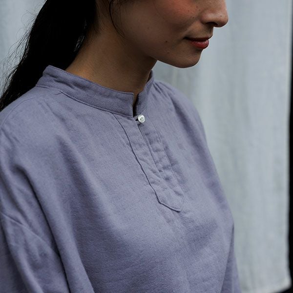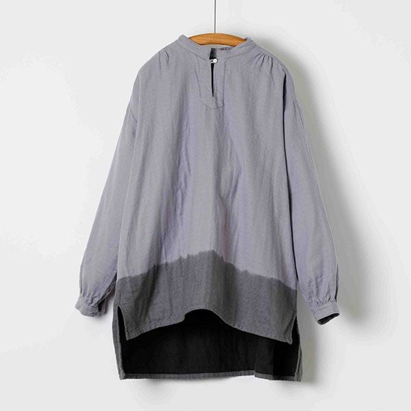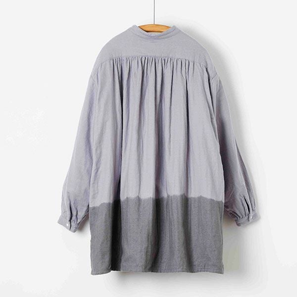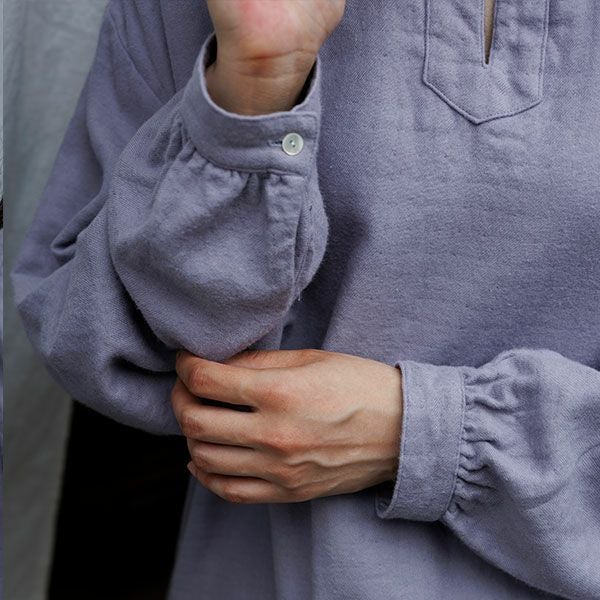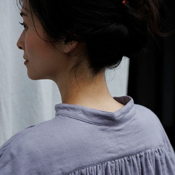 袖口と脇のスリットがさっとはいっており肩と後ろヨークにはギャザーが入った生地の表情豊かなブラウスです。後ろの丈が長めで着る人の動きに合わせて揺れる様子が美しいです。