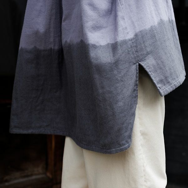 パープルの表地にチャコールグレーの裏地です。裾上部分をグレーに手絞りしております。
