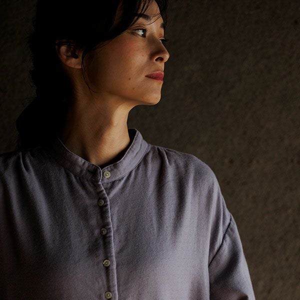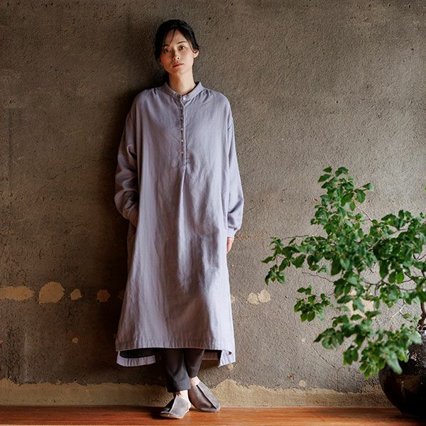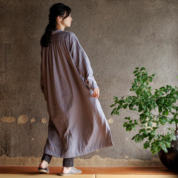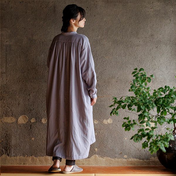 袖口と脇のスリットがさっとはいっており肩と後ろヨークにはギャザーが入った生地の表情豊かなブラウスです。膝下までしっかりと長さがあるので一枚で十分着られるのが嬉しく、程よく存在感もあり一枚でもコーディネートが決まるワンピースです。後ろの丈が長めで着る人の動きに合わせて揺れる様子が美しいです。