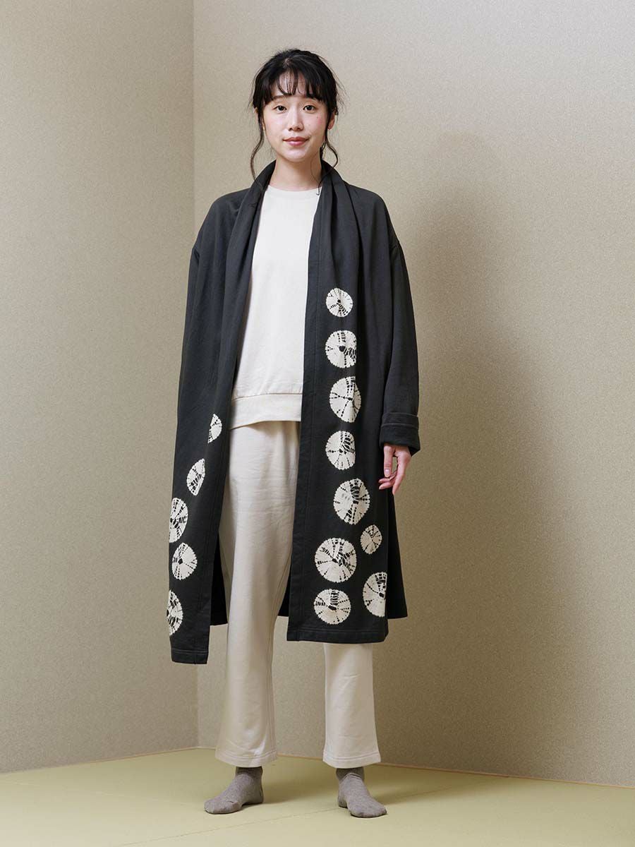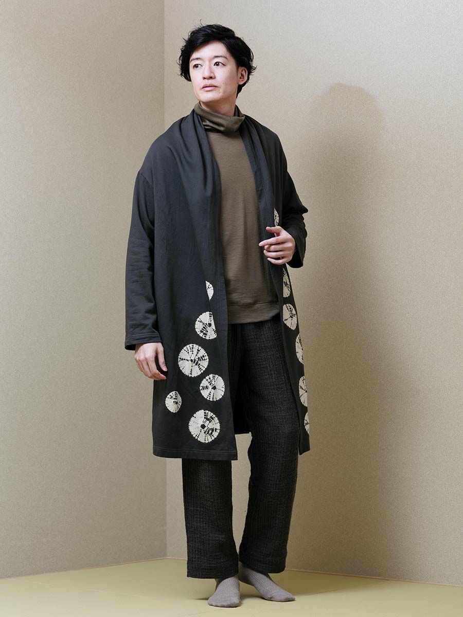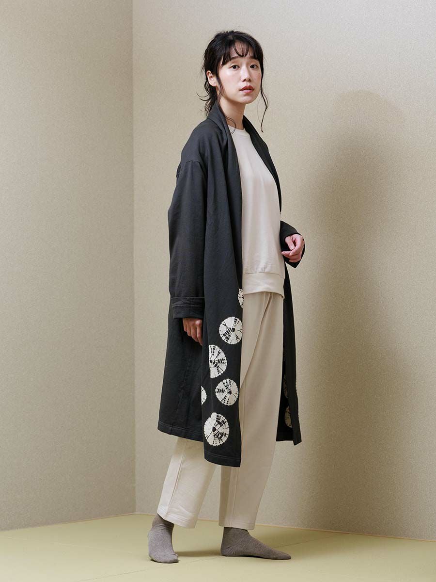 横幅は大きすぎず小さすぎず、リラックスできながらも見た目がだらしなく崩れないような丁度いいサイズを目指しました。優しく肩から背中にローブをかけるイメージで前ボタンはあえてなくしました。