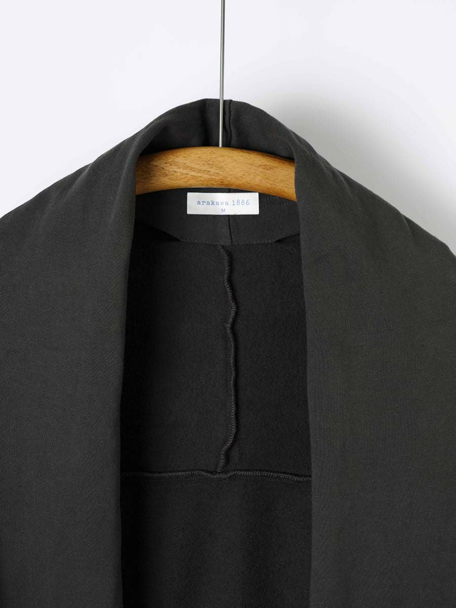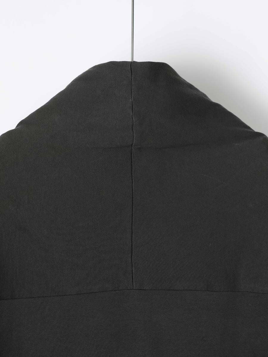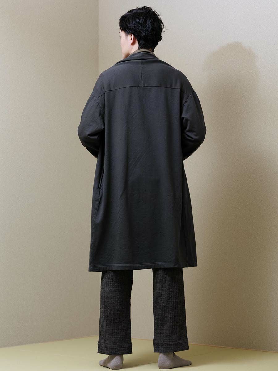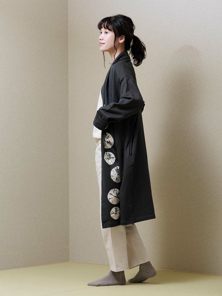 横幅は大きすぎず小さすぎず、リラックスできながらも見た目がだらしなく崩れないような丁度いいサイズを目指しました。優しく肩から背中にローブをかけるイメージで前ボタンはあえてなくしました。