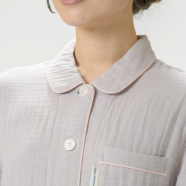 シームレス縫製を採用した、フワフワさらさらの3重ガーゼパジャマ。軽くてしなやかな素材にマッチする、ほんの少しくすませた上品で優しいピンク、グレー、ダークネイビーの3色展開。クラシックなデザインに大人っぽいカラーリングでポイントになるパイピングも相性の良いシックなカラーを選びました。心地良い眠りを追求し、快眠に導くためのオリジナル縫製を採用した※「arakawa1886 快眠プロジェクト」オリジナルパジャマです。特に肌の弱い方にもお勧めしやすいアイテムです。非常に細い糸であまく織りあげた生地を3層に重ねた3重ガーゼを使用しています。生地の時点で洗いをかけて独特のシボを出してフワフワに仕上げました。吸水性、放湿性に優れた快眠に最適な素材となっております。
