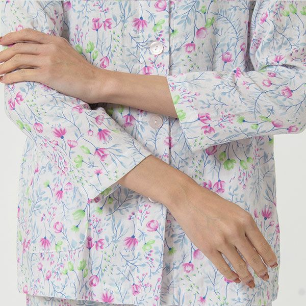 上品な花柄の綿100%二重ガーゼパジャマです。色とりどりの花柄プリントが上品に映える爽やかなデザインで、派手すぎず、程よい華やかさで心地よい印象に仕上げました。 ラグラン袖は腕を動かしやすいデザインです。 上着に腰ポケットを付けているので、ちょっとした小物入れに便利です。素材はパジャマに最適な二重ガーゼ。 甘撚りの糸で薄く粗く平織りした綿織物で、その柔らかさがやさしく体を包み、快適な睡眠を促してくれます。 ガーゼ独特の軽くてサラッとした肌触りや、優れた吸湿性・放湿性も魅力のひとつです。