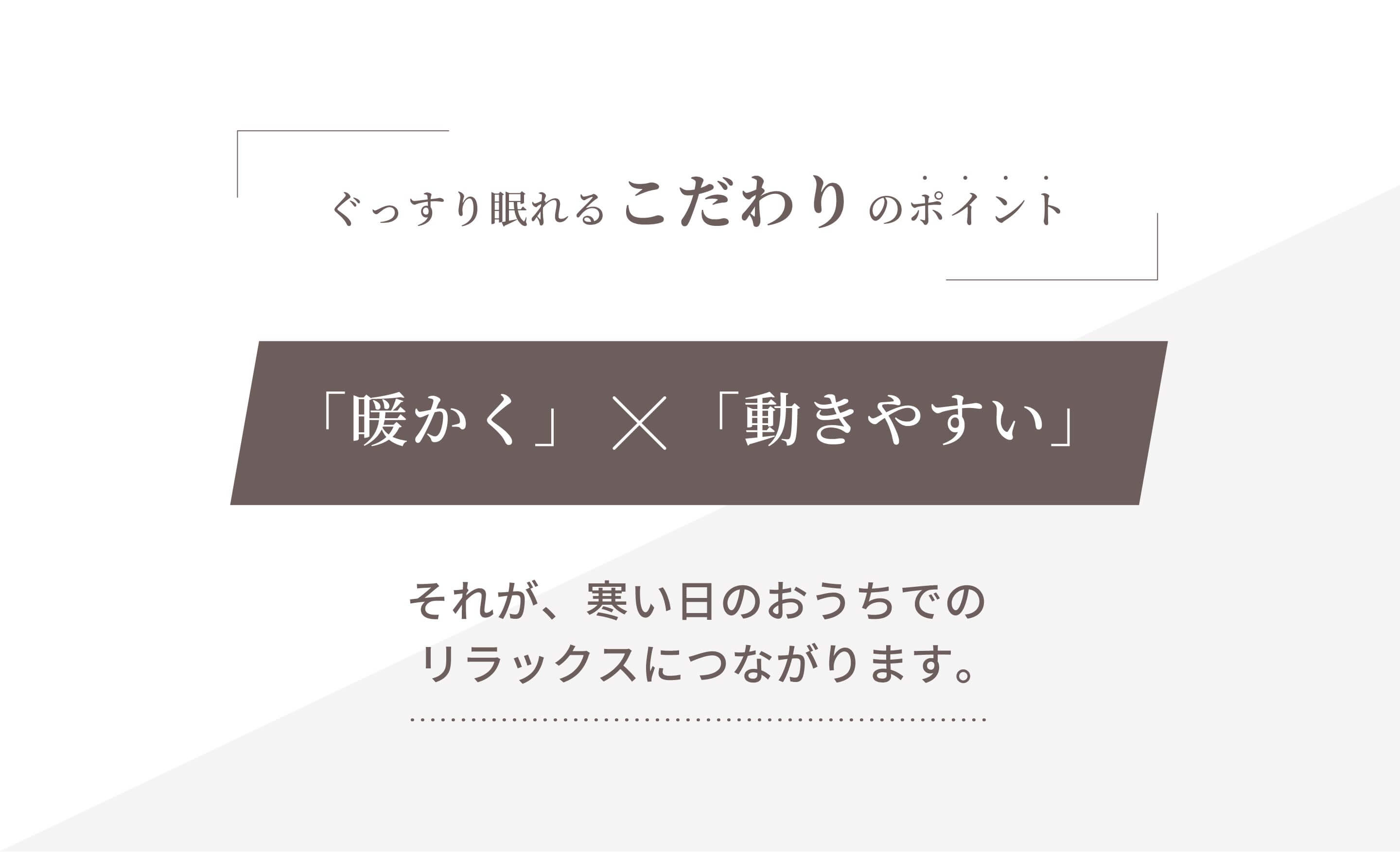 ほんとに良いウェアです。毎日着てます。眠るときではなくリラックスウェアとして。暖かいです。年末年始も安心です。