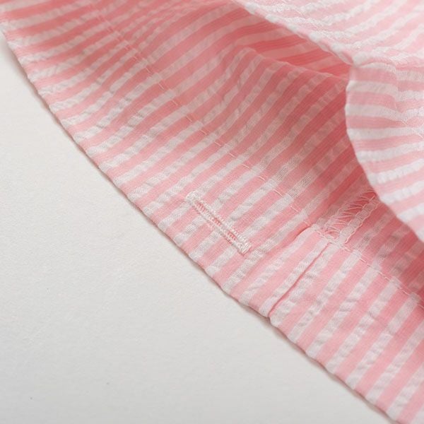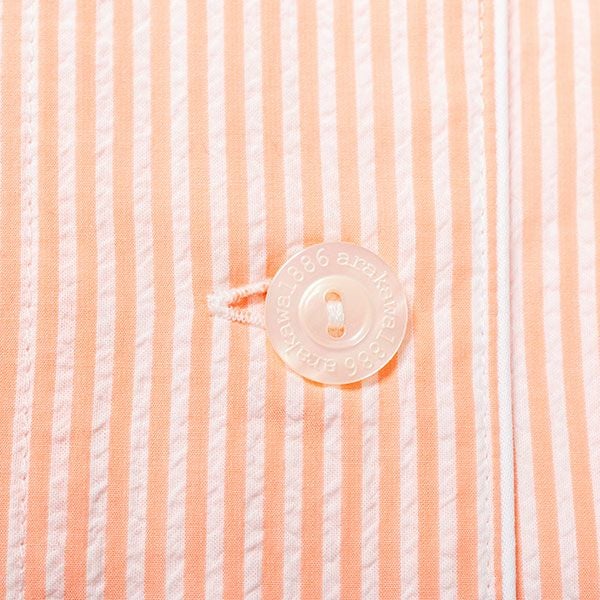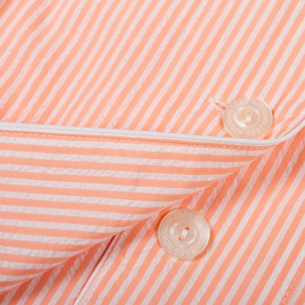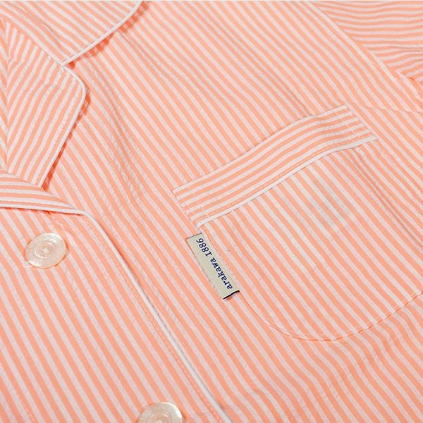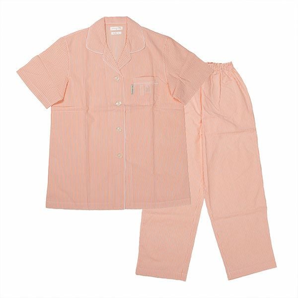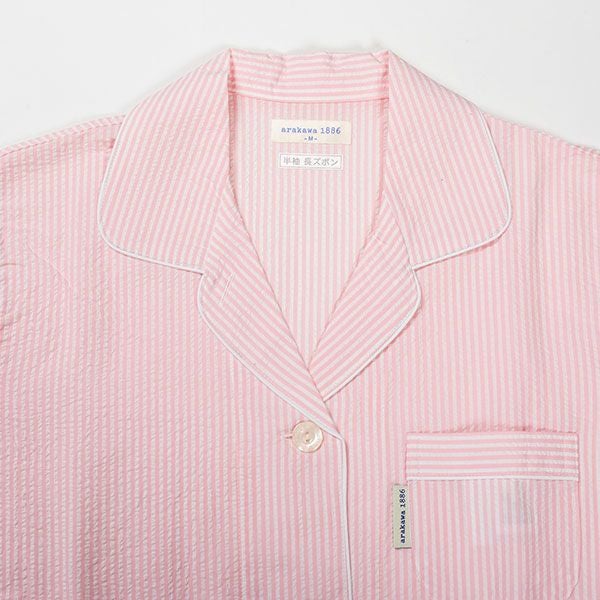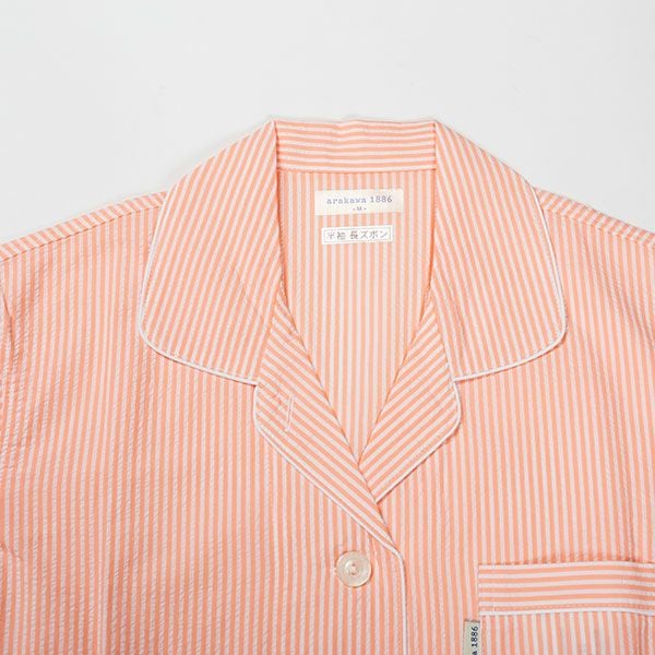 シンプルなストライプ柄のパジャマです。色はピンク・サックス・オレンジの3色展開です。心地良い眠りを追求し、快眠に導くためのオリジナル縫製を採用した「arakawa1886 快眠プロジェクト」オリジナルパジャマです。ベーシックな半袖シャツタイプのパジャマスタイルですが、締め付けの少ない2本ゴムや、衿のブランドネームがシールになったはがせるネームのため着用時の不快感がありません。また、品質表示もポケットの中に隠しているため着用したときに肌に当たりません。70番手の細い糸を使用した、サラッとした肌触りの良い綿100%サッカー素材です。贈り物にも喜ばれるパジャマです。