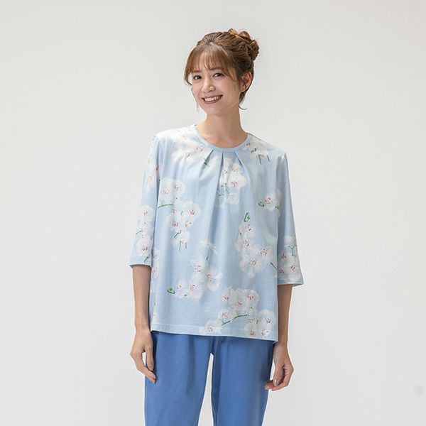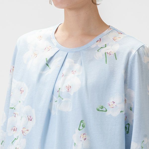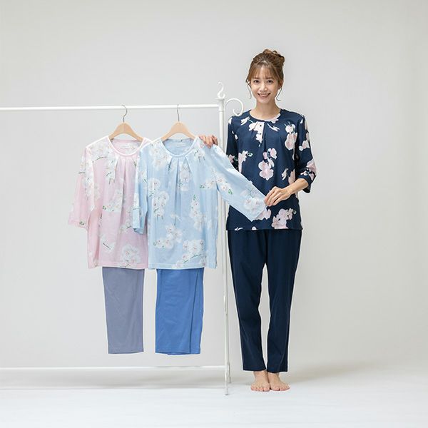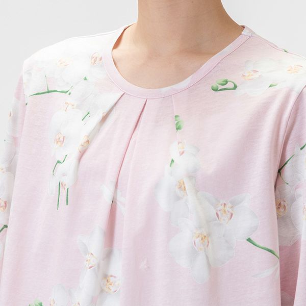 パジャマには胡蝶蘭がプリントされており、上品なデザインに仕上がっております。
