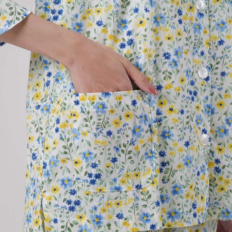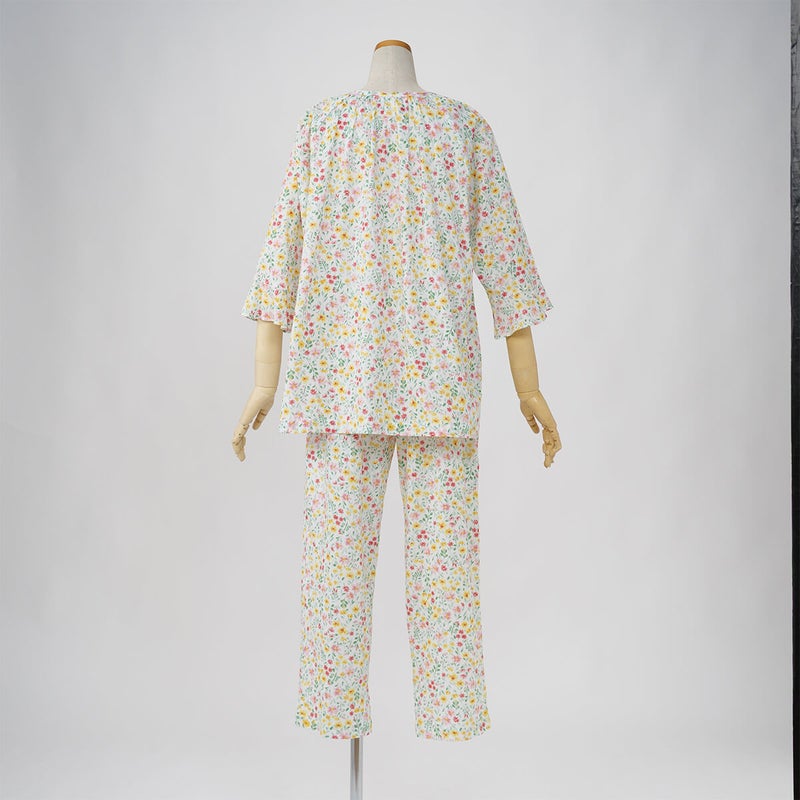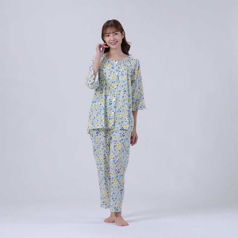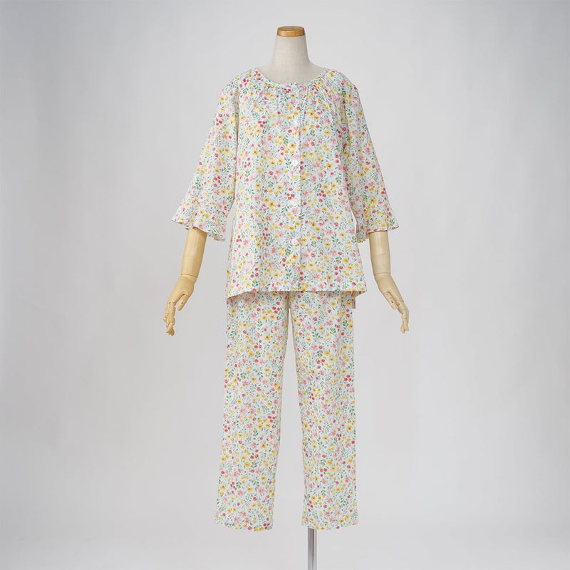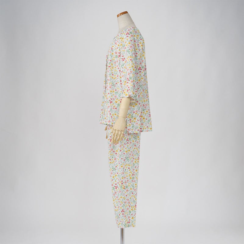 やさしい色合いの中花柄が上品で、落ち着いた大人のリラックススタイルにぴったり。軽やかで涼しげな印象に仕上げています。