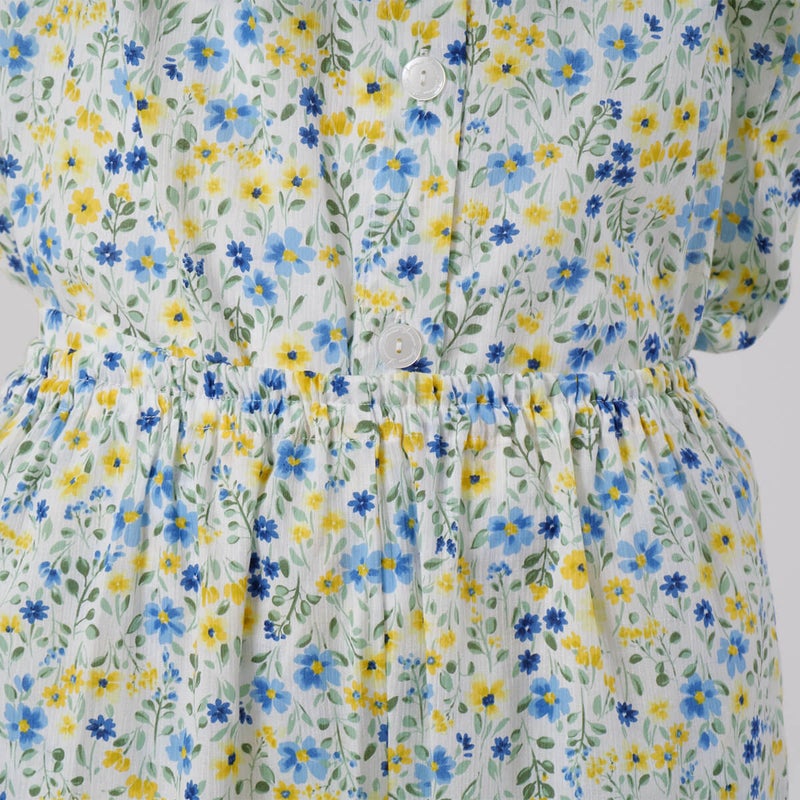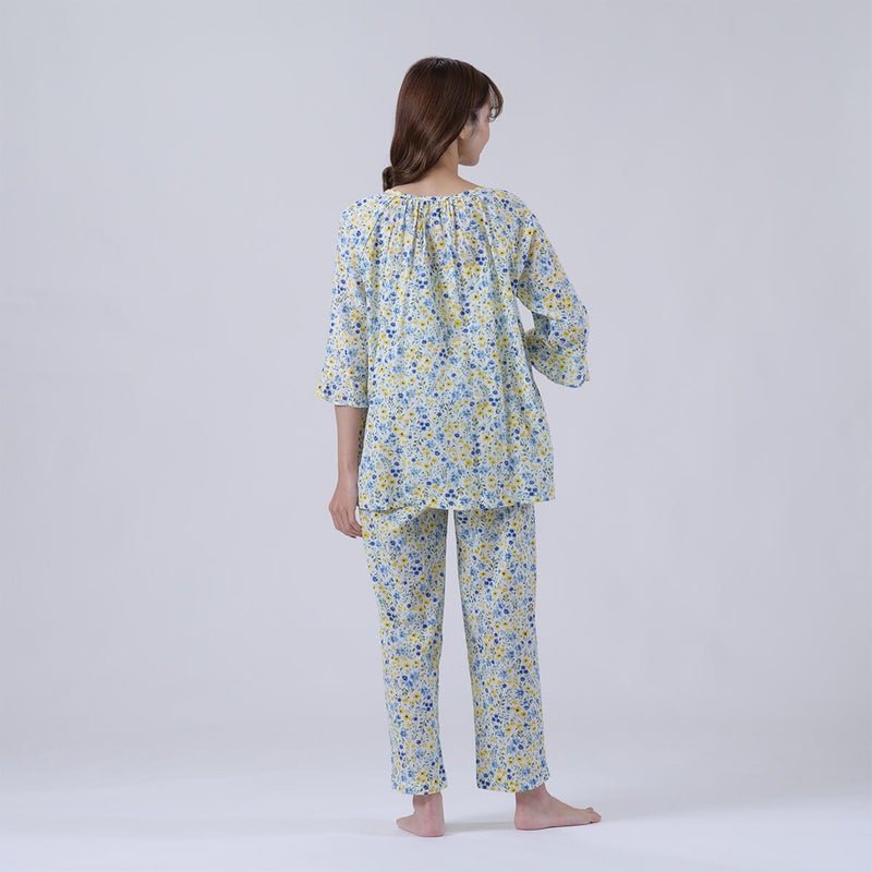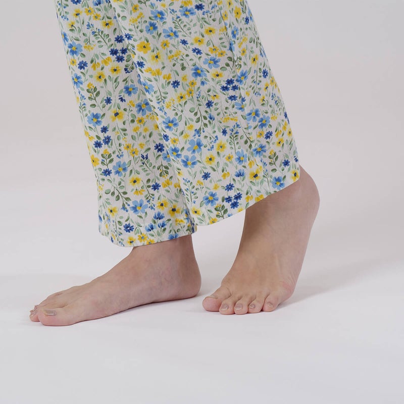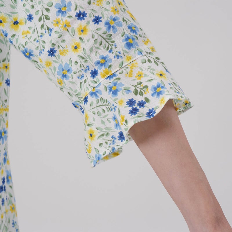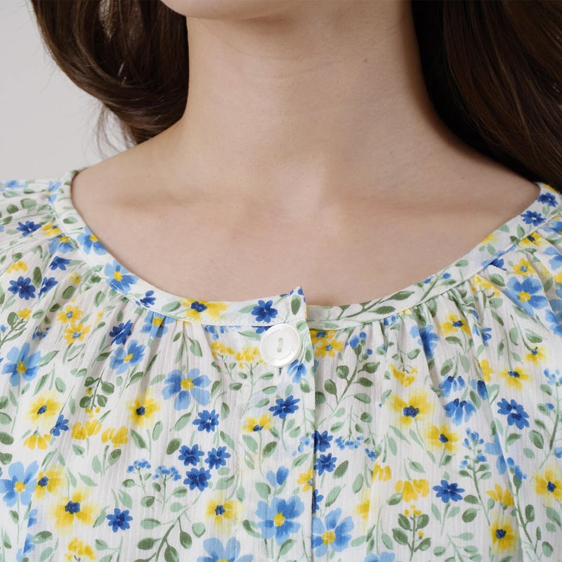 やさしい色合いの中花柄が上品で、落ち着いた大人のリラックススタイルにぴったり。軽やかで涼しげな印象に仕上げています。