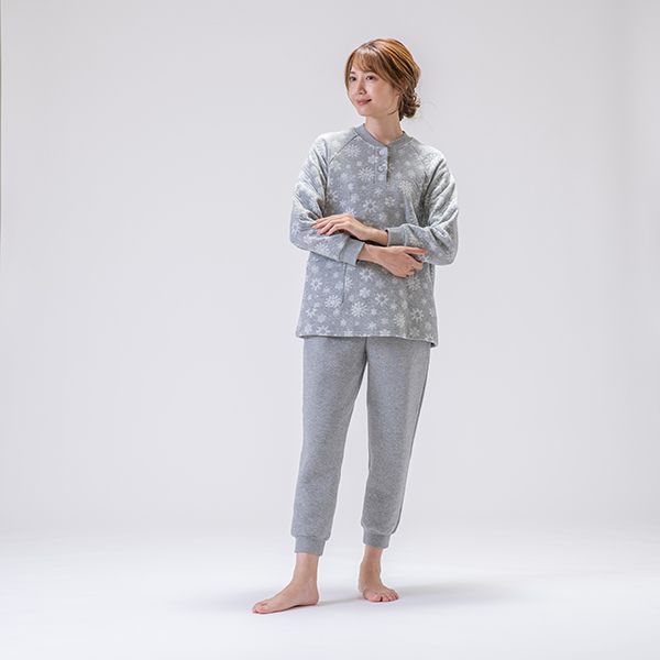 シンプルで可愛らしい雪柄がプリントされた冬用のパジャマです。