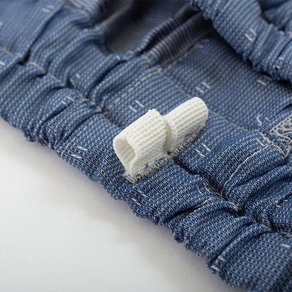 また、袖口、ウエスト、ズボン裾口にゴム通し穴をつけているので、調節やアレンジが可能です。