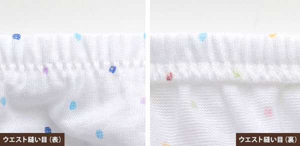 ![]() ウエストは平ゴムを生地に通しています。直接素肌にゴムが当たらないので、肌あたりも快適です♪ |