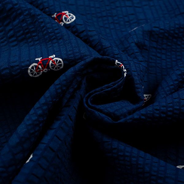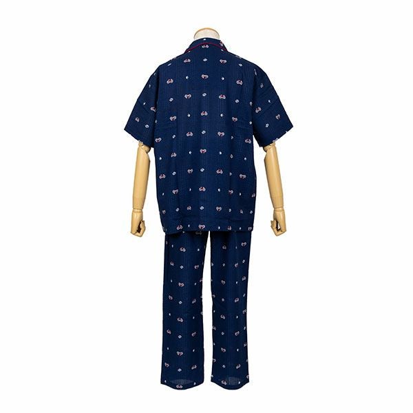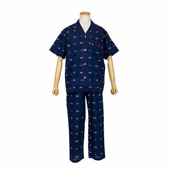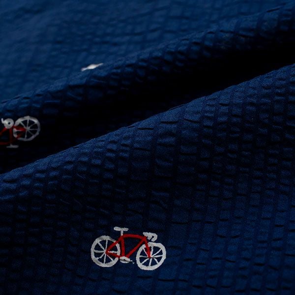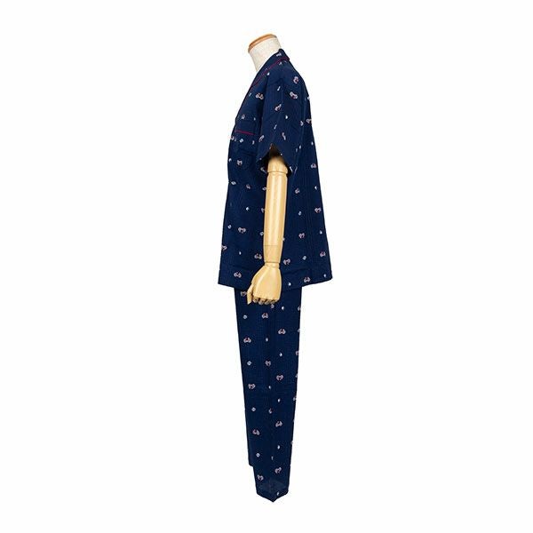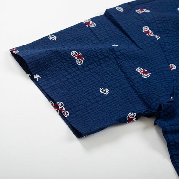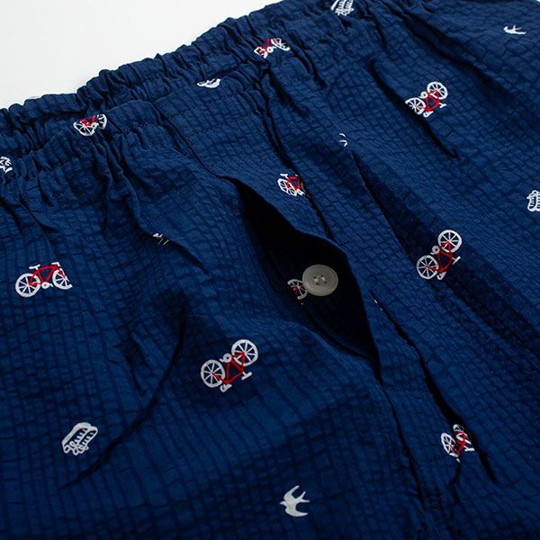 自転車、スニーカー、ツバメのプリントが目を引くパジャマです。ネイビー・グレーの2色展開です。半袖シャツタイプのベーシックなデザインです。全体を引き締めるパイピングがポイントです。胸元のポケット付き。ズボンは前開き仕様で、ウエストは締め付けを軽減する2本のゴム仕様です。素材は綿100%の織地にリップル加工を加え、生地表面に凹凸をつくりました。生地がでこぼこしていると、肌離れが良く、汗をかいてもべたつきません。涼しげで軽くシャリ感があるので、暑い時期におすすめです。