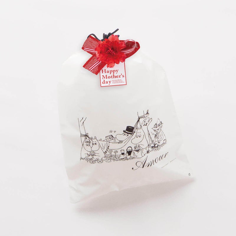 アムール巾着ラッピングに、カーネーション造花を添えた、母の日仕様のギフト商品です。