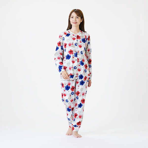 トップスは前開きタイプで着やすく、袖口とパンツの裾口が絞ったタイプなのでずり上がりにくく暖かく過ごせます。