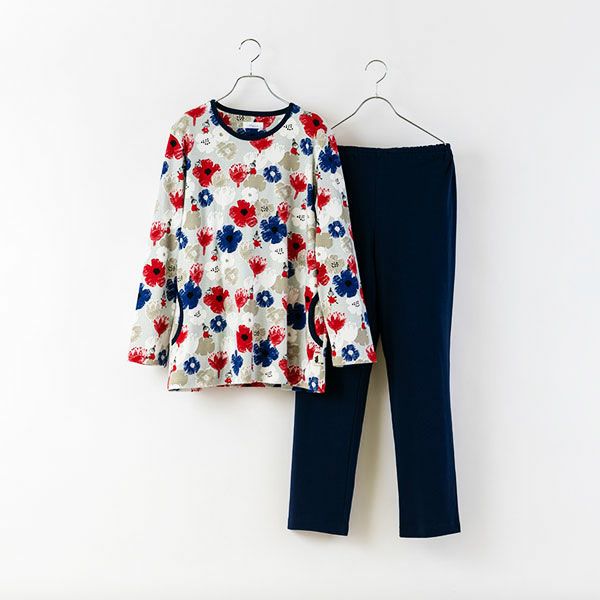 また、ボトムはすっきりとしたシンプルな無地のパンツをセットしているのでルームウェアとしてもご利用いただけます。