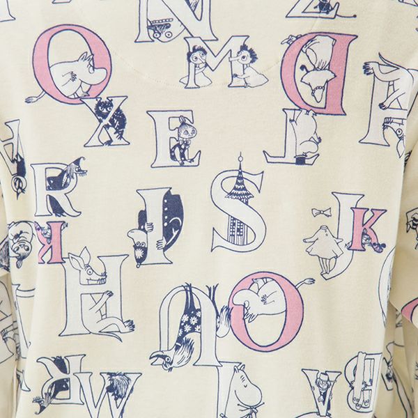 カラーはシックなモノトーン系でまとめたアイボリー、グレー、ネイビーの3色展開。ABCD...アルファベットとムーミン谷の仲間たちをちりばめた楽しいプリントが印象的です。