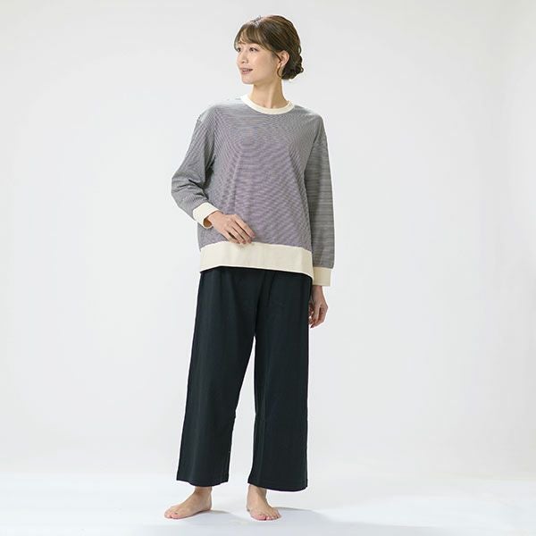 ボーダーリブのトップスと無地のパンツの上下セット。 シンプルで着回しやすく、部屋着としても快適に過ごせるデザインです。 色はベーシックなブラック(黒色×クリーム)とグレー(グレー×水色)の2色展開。裾と袖口、ネックに施されたリブが特徴のデザインになっており、パンツはセミワイドでゆったりと着ていただけます。サラリとした先染めの天竺素材で 柔らかい肌触りなのに、長く使える丈夫さが魅力です。
