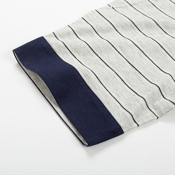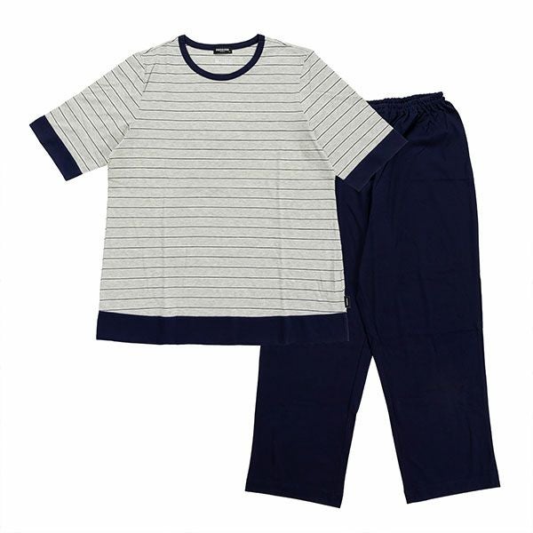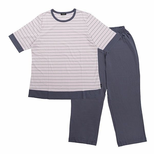 シンプルな天竺ボーダー ×無地の上下、半袖8分ズボンの組み合わせセットです。ピンクとグレーの2色展開です。 シンプルかつ定番のデザインはどなたにでもおすすめできます。上着はかぶって着るプルオーバー。無地のズボンを合わせているのでパジャマとしてはもちろんですが、ルームウェアとしても重宝します。素材は柔らかく、肌触りの良い綿100%の薄手の天竺素材、吸水性もあります。夏の暑い時期も快適にお過ごしいただけます。