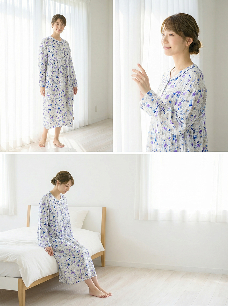 フワフワで柔らかいシャーリングガーゼのムーミンプリントドレス。ムーミン谷に咲く花や木の実がちりばめられた中に、ムーミンやリトルミイの姿がちらほらとのぞくボタニカルなプリントです。フワフワ素材に優しいペールトーンのプリントが春らしくかわいい一着。ノーカラーでフロントオープンタイプ、脱ぎ気がしやすくとっても軽い着心地です。袖口にゴムを入れてふんわりさせたフェミニンなデザインですが、家事などする時には肘うえで止まるのがとても実用的。ゆったりと締め付けが無く、マタニティーとしても使えるデザインです。シャーリングガーゼ素材は肌にまとわりつかず、吸水性も高いので春から真夏まで活躍します。お洗濯後の乾きがよいのもオススメです。