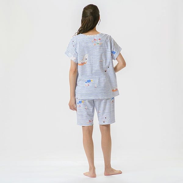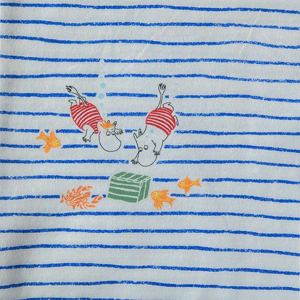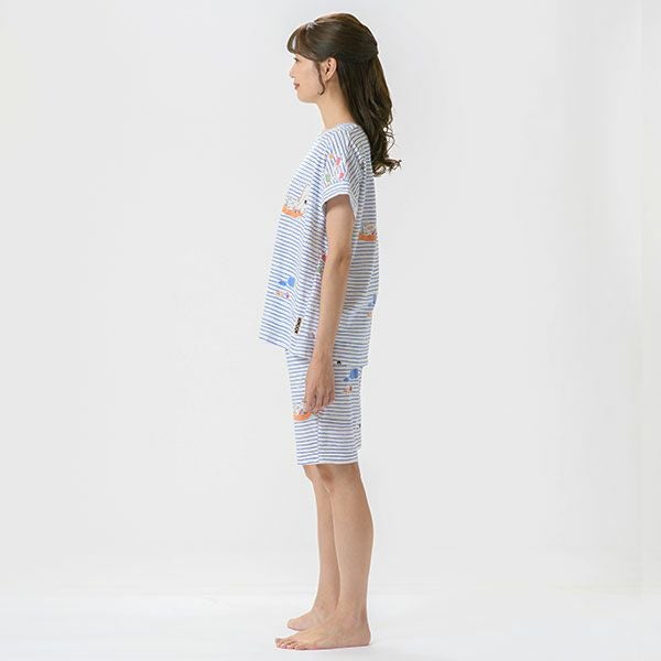 北欧テイストの明るいカラーリングがまるで絵本の世界のような楽しいプリントにマッチしています。ボーダーで表現した海の世界でヨットに乗ったり、宝物を探したり、ムーミンファミリーの姿に心が癒されます。楽しいプリントのTシャツは毎日を楽しくしてくれます!パジャマでも部屋着にも最適です。シンプルでゆったりした着心地のプリントTシャツと5分丈のパンツをセットにしました。着心地の良い柔らかい素材を使用しているのでパジャマとしてはもちろんですがルームウェアとしても動きやすく重宝します!ボトムには両サイドにスラッシュポケットがついているのでとても便利。柔らかく、肌触りの良い綿100%の天竺素材、吸水性もあります。