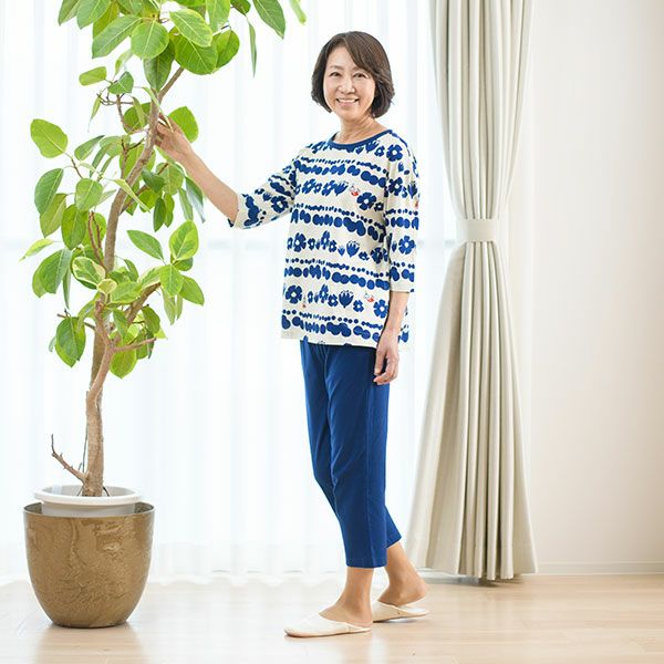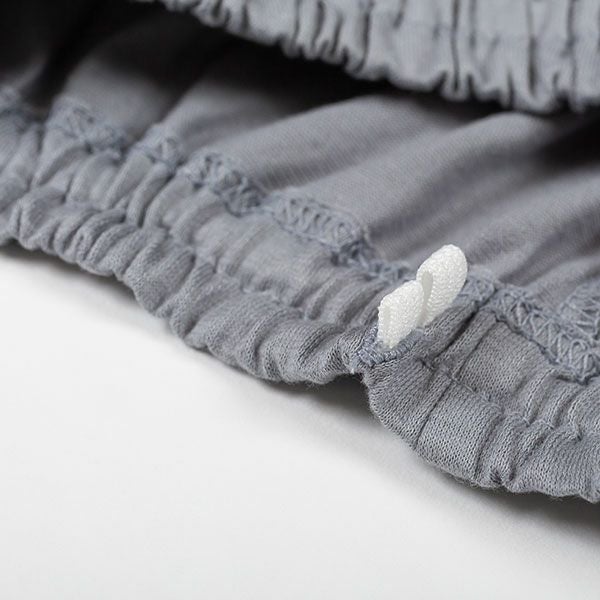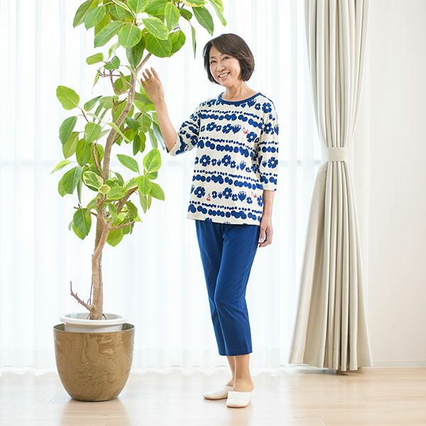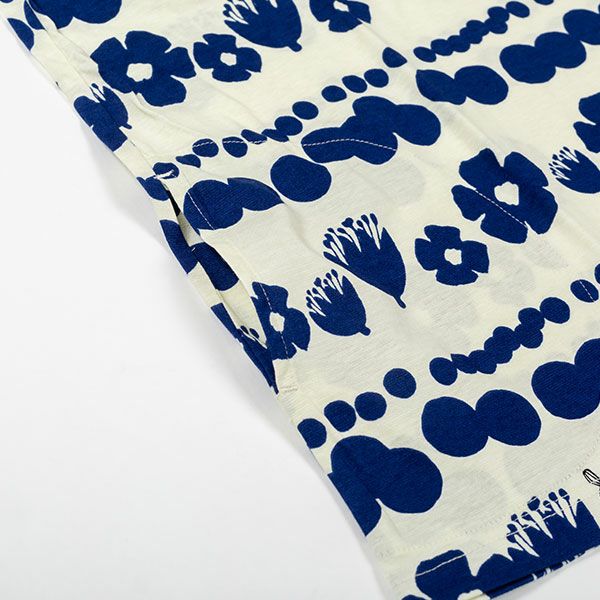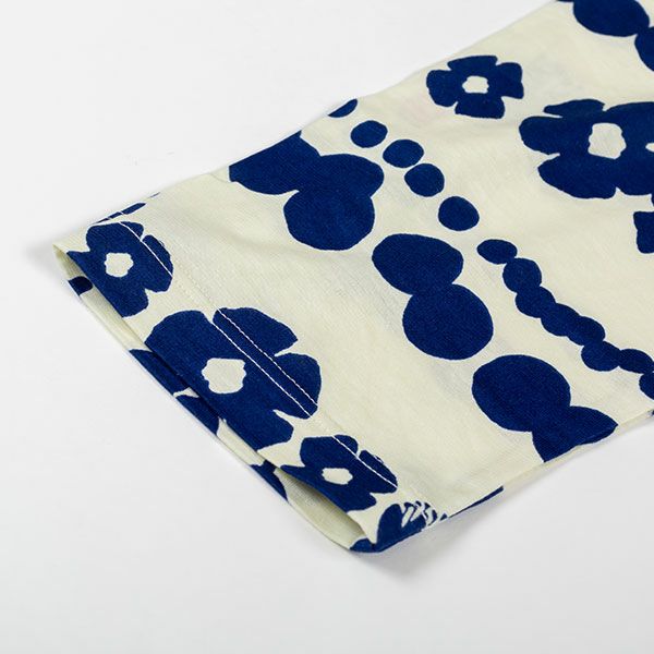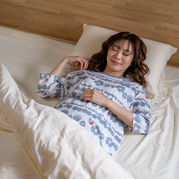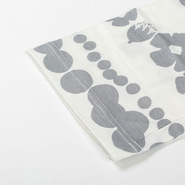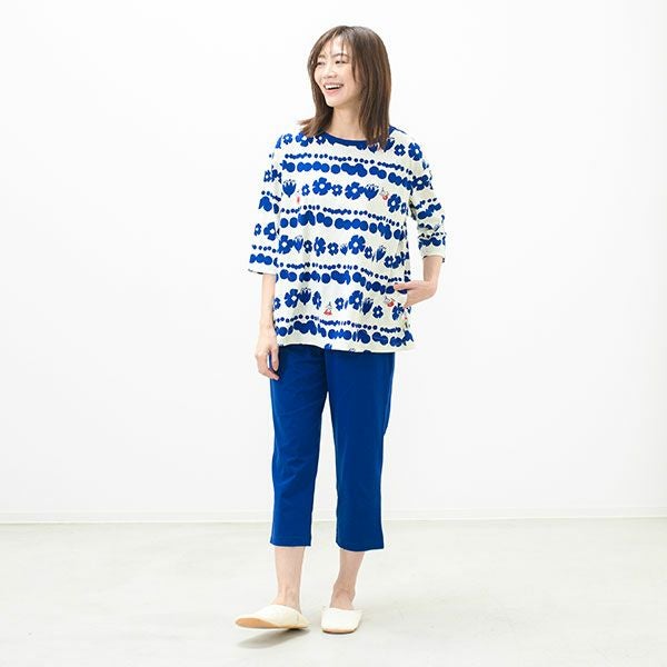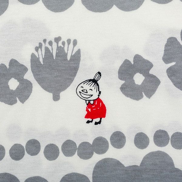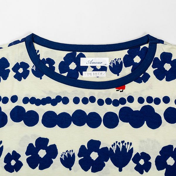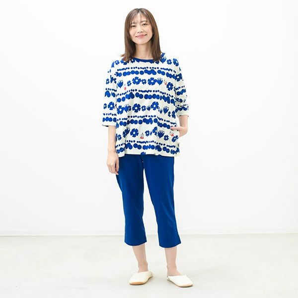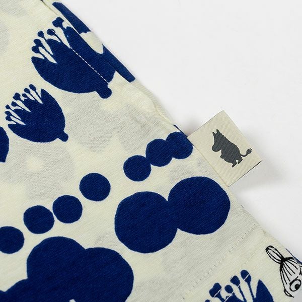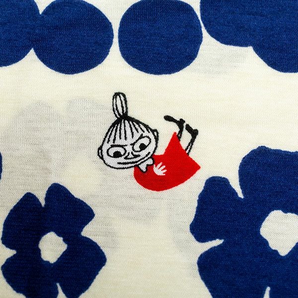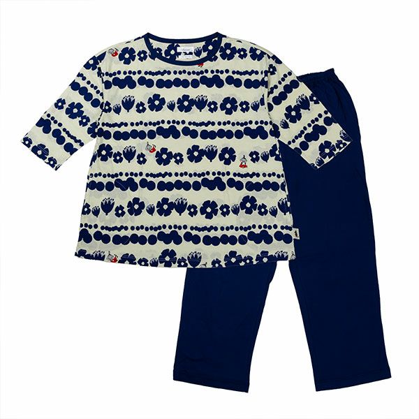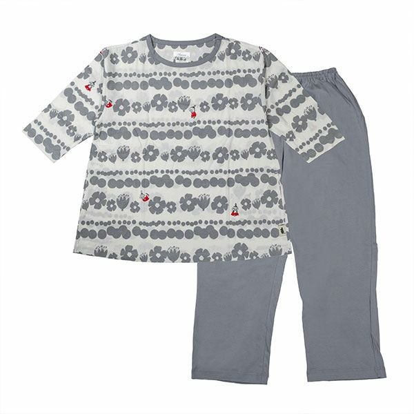 トップスにリトルミイ、花と水玉模様を組み合わせた柄をプリントしました。落ち着いた色目にリトルミイのトレードマークである赤い服をポイントにしました。色はネイビー・グレーの2色展開です。トップスは7分袖のかぶりタイプ。ボトムは無地の8分丈です。着心地の良い柔らかい素材を使用しているのでパジャマとしてはもちろんですが、ルームウェアとしても動きやすく重宝します!トップスには両サイドにスラッシュポケットがついているので便利です。柔らかく、肌触りの良い綿100%の天竺素材、吸水性もあります。