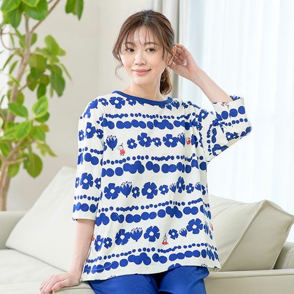 【MOOMIN ムーミン】×【Amour アムール】ムーミン谷に咲く花とリトルミイ、水玉模様がプリントされた7分袖Tシャツのセットアップ
