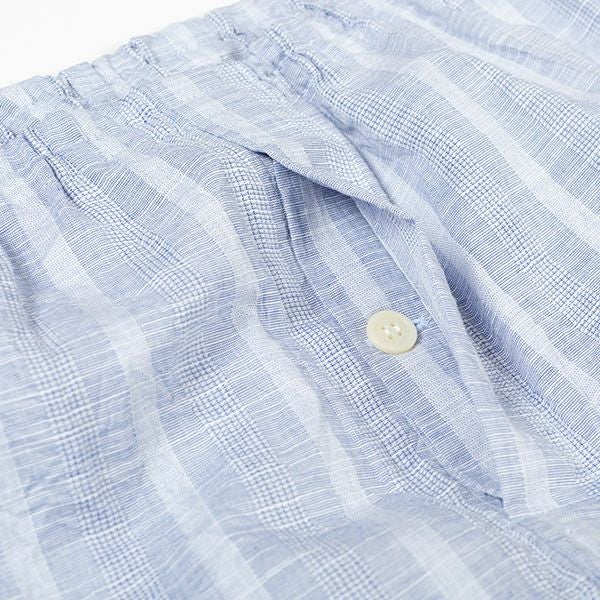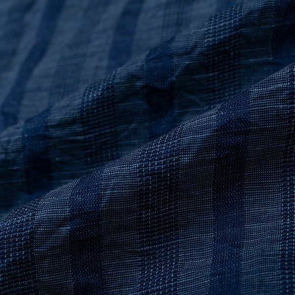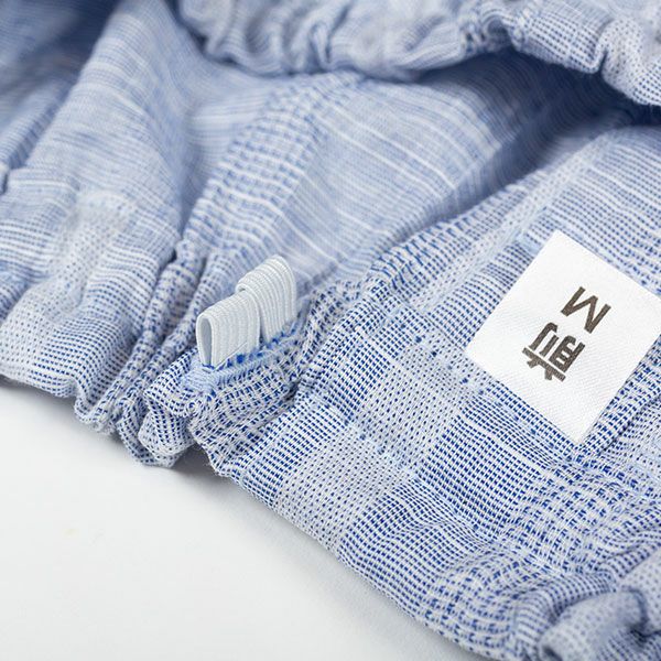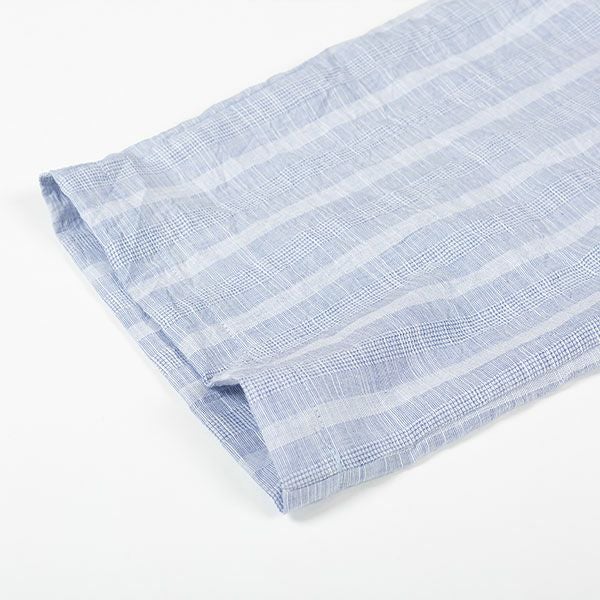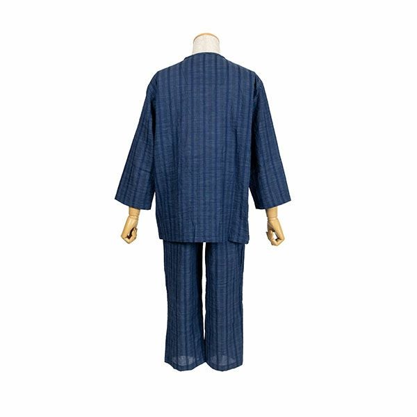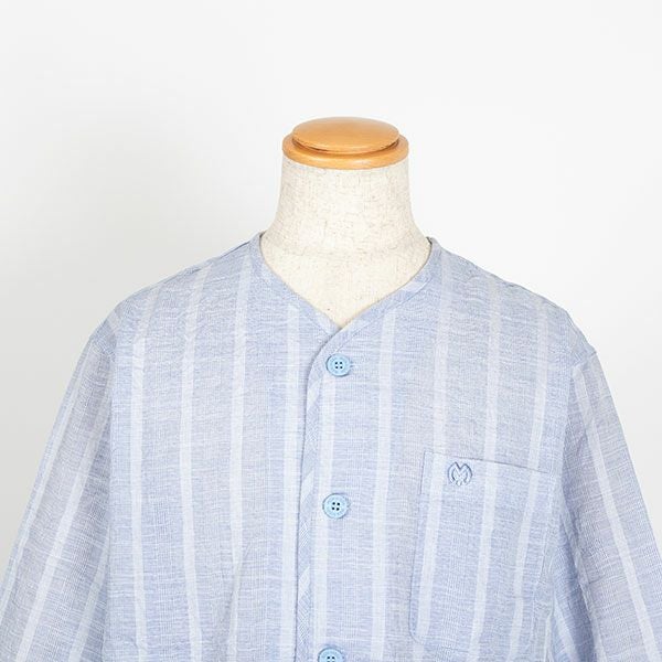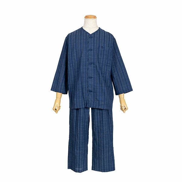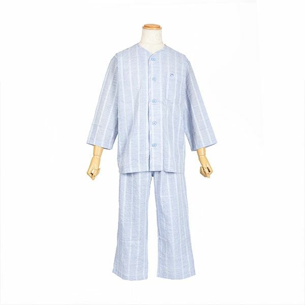 清涼感あるワッシャー加工の生地を使用したストライプパジャマです。ブルー・サックス・ネービーの3色展開です。ストライプ柄で落ち着いたカラーなので、ギフトにもおすすめです。汗ばむ初夏から着ていただける紳士8分袖・8分丈ズボンパジャマです。上着はすっきりとした首元で前あき全開ボタンタイプ。胸元にポケットがあります。袖は涼しげな8分袖。ズボンは前開きあり。ウエストは、やわらかい2本のゴム仕様にしているので、締め付け感を軽減します。裾は8分丈で仕上げてあります。素材は綿100%のワッシャー加工(しわ加工)された生地を使用しています。 軽量で通気性がよく洗いざらしのような肌ざわりが汗ばむ季節には快適です。
