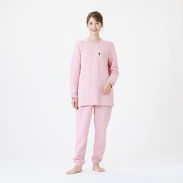 冬の森をイメージしたクマ柄のジャガードキルト。雪の結晶や森の木々の間にクマがいますが中にはベストを着たクマもいますよ♪襟元、袖口、足口にリブを使ったカジュアルなデザインです。お休み中にもずり上がりにくく暖かくお休みになれます。こちらの素材は表側も肌側も綿100%の天竺生地を使用し、あいだにポリエステルのワタを挟んでいます。冬でも綿の肌触りで気持ちよくお休みになれますが、ふっくらとしたワタがとても暖かく真冬に最適です。また、こちらの素材は洗濯後も中綿が乾きやすく洗うたびにふっくらとしますのでお手入れもしやすい商品です。トップスがスポットかぶれるプルオーバーでおなか回りもとても暖かいデザインです。
