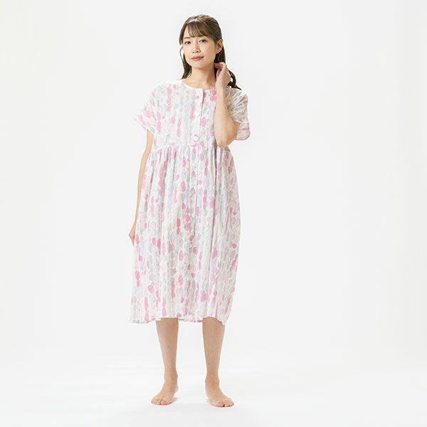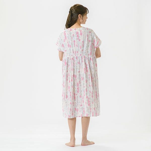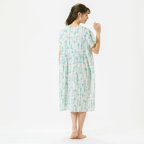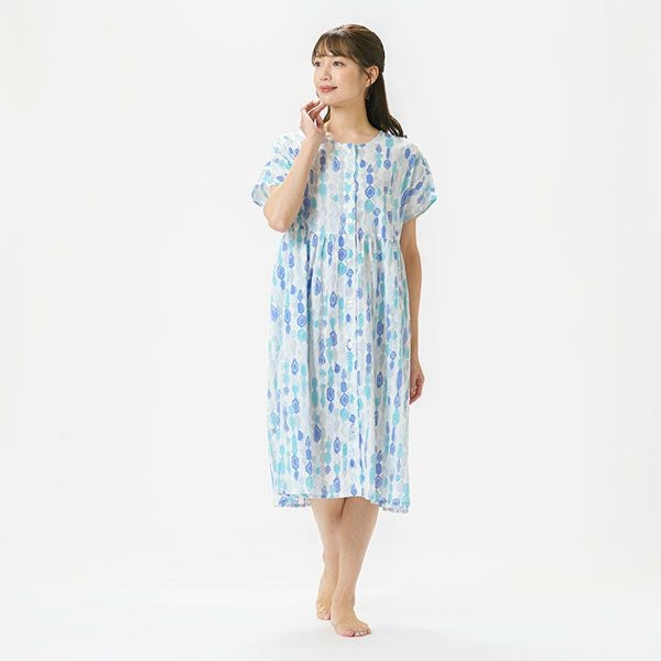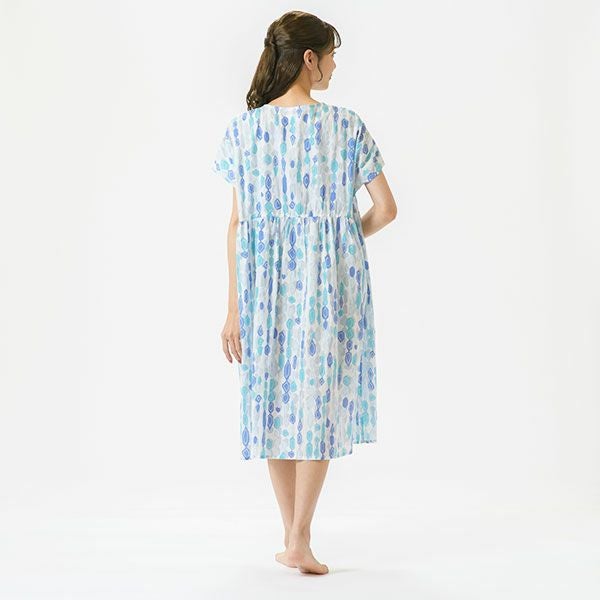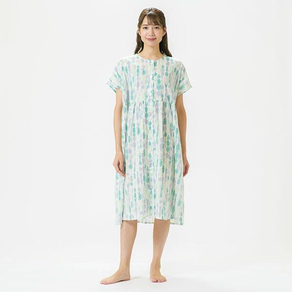 モダンなダイヤ柄で涼しい着心地の高島クレープのホームドレスです。優しいタッチで描かれたモダンなダイヤ柄がプリントされています。 ピンク・ブルー・グリーンの3配色です。肩が隠れるフレンチスリーブの半袖ホームドレスです。涼しく着用して頂けます。素材はサラッとした肌触りと吸汗性に優れた高島クレープを使用しています。