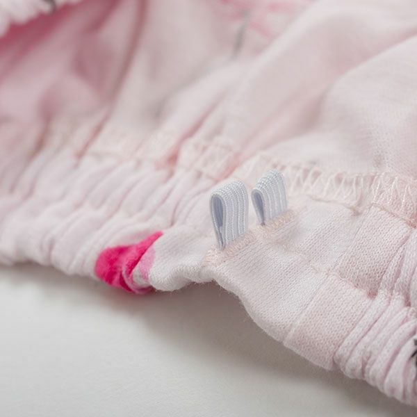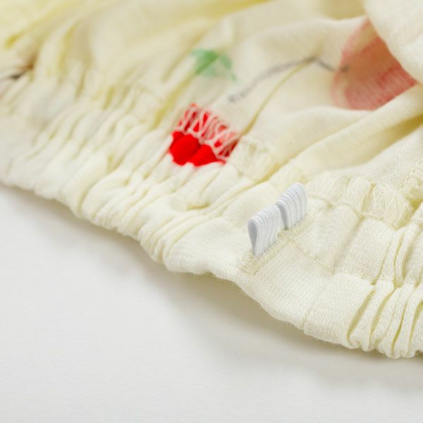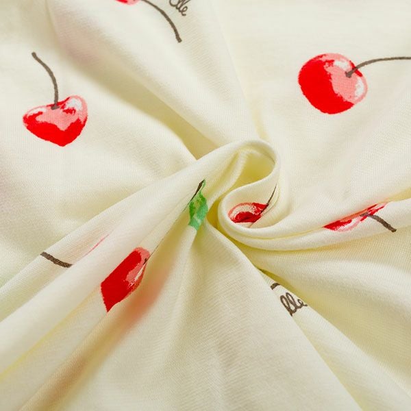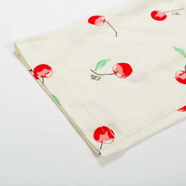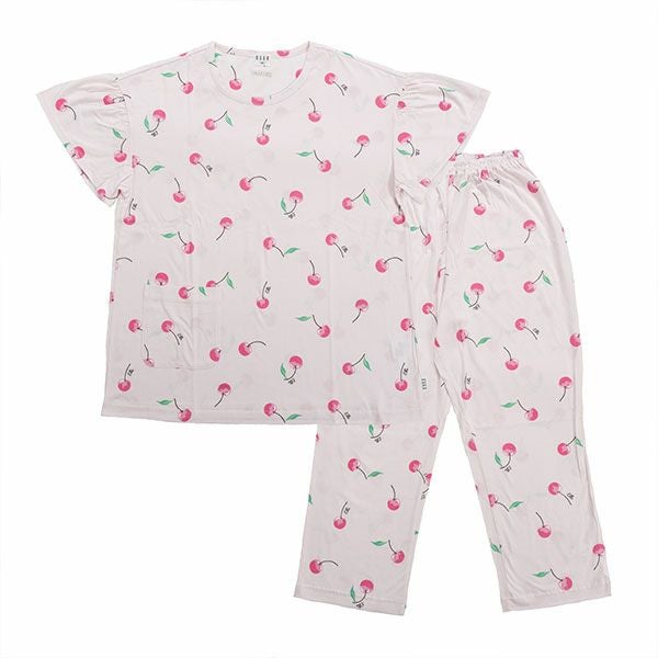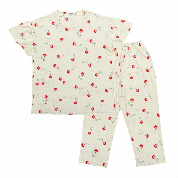 可愛いチェリープリントをした半袖・8分ズボンパジャマです。明るいアイボリー、ピンクの2色展開です。トップスはTシャツタイプで、袖口がフレアになったフェミニンなデザインです。腰にポケットがついているのでちょっとした小物入れに便利。素材は柔らかく、肌触りの良い綿100%の薄手の天竺素材、吸水性もあります。夏の暑い時期も快適にお過ごしいただけます。