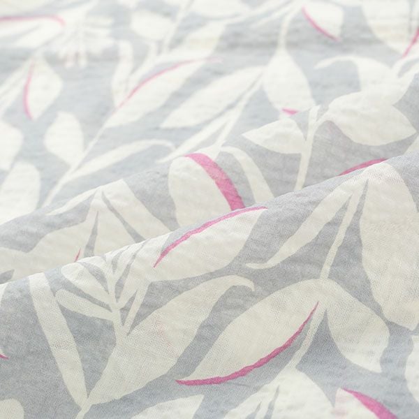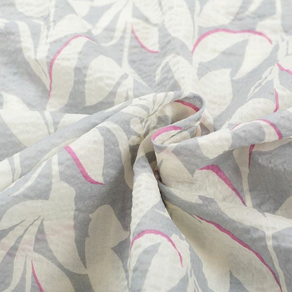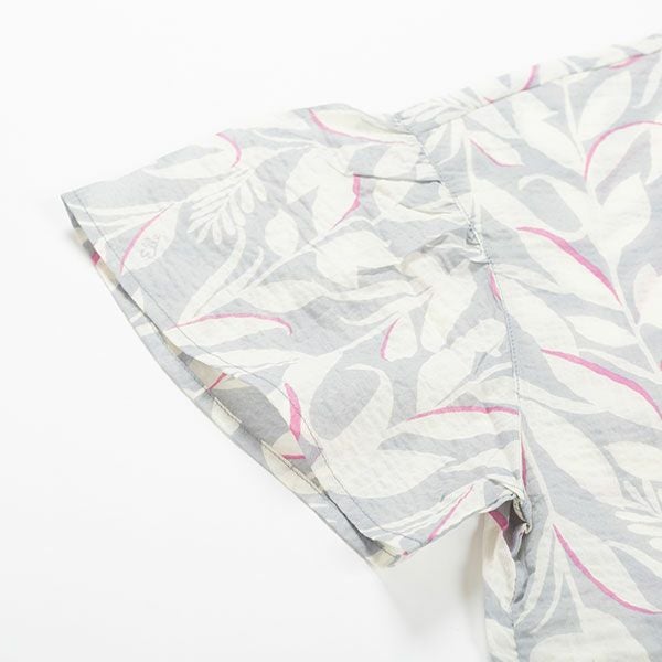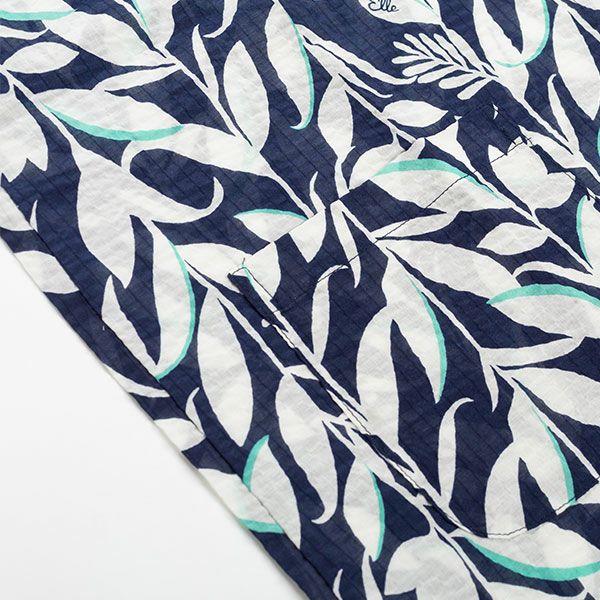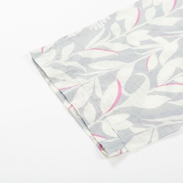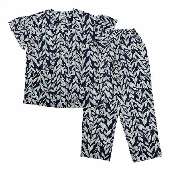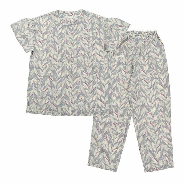 リーフプリントが目を引く半袖パジャマです。グレーとネイビーのシックな2色展開ですが、それぞれに差し色を入れてポイントにしています。トップスは袖口がフレアになっているフェミニンなデザイン。前開き、襟なしで首元がすっきりしています。ボトムは長ズボンです。腰にポケットがついているのでちょっとした小物入れに便利。素材は綿100%の織地にリップル加工を加え、生地表面に凹凸をつくりました。生地がでこぼこしていると、肌離れが良く、汗をかいてもべたつきません。涼しげで軽くシャリ感があるので、暑い時期におすすめです。