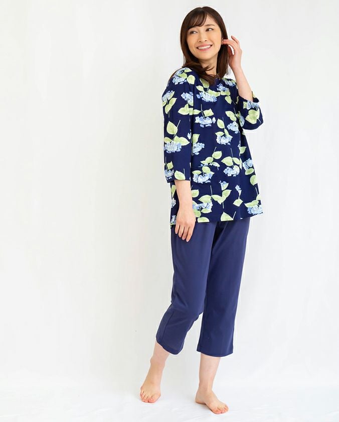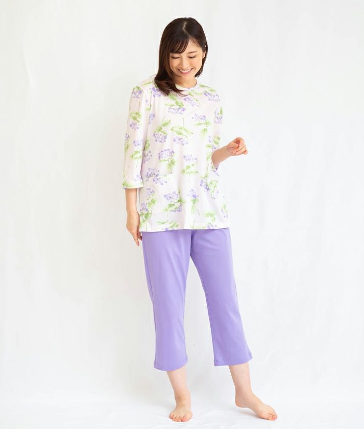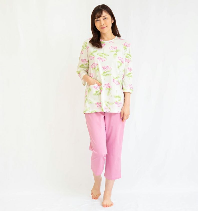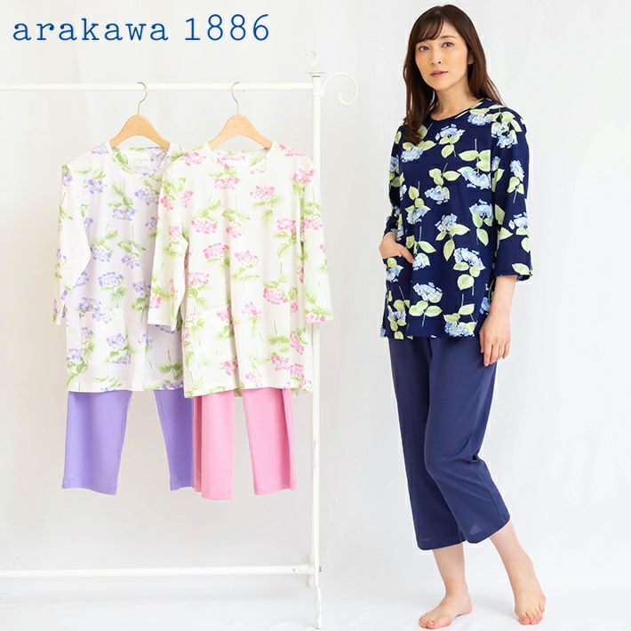 【Arakawa1886】 天竺ニット 薄手 レディース プルオーバー 上下セット 【額紫陽花プリント×無地】