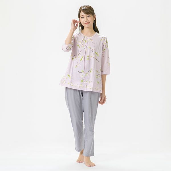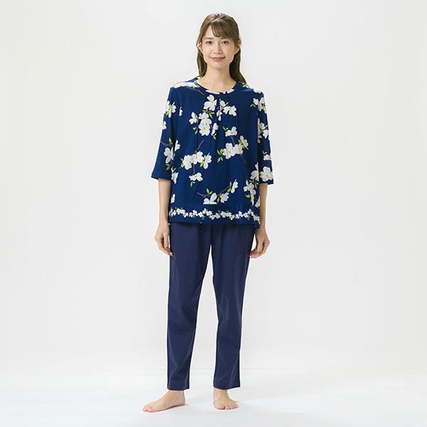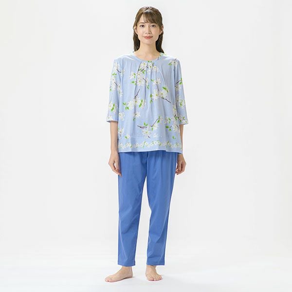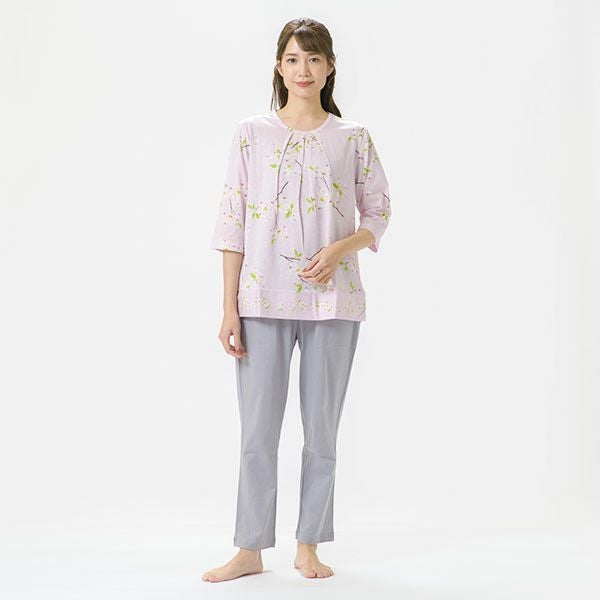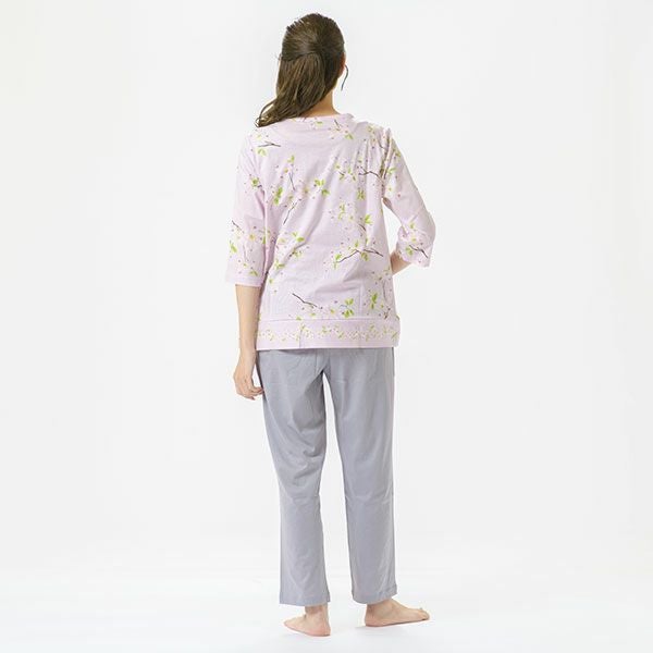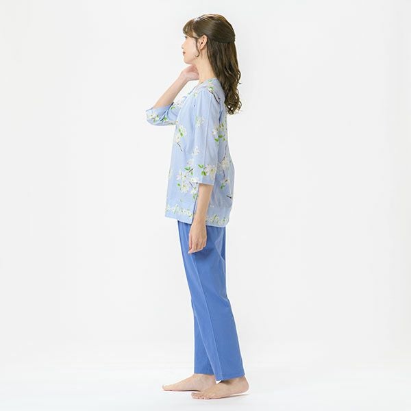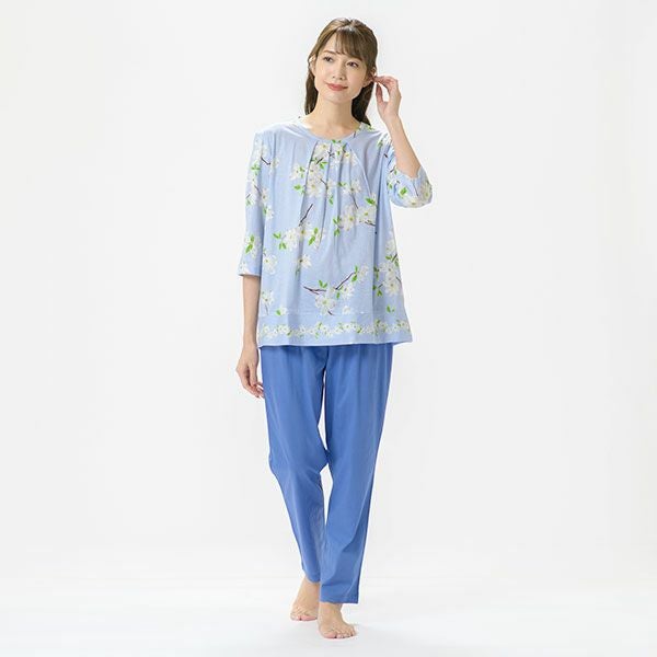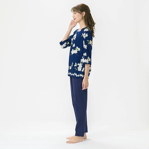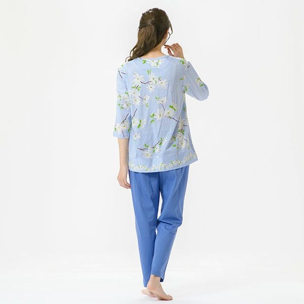 日本の春を告げる花、「ハナミズキ」の美しいプリントが映える7分袖ナイトウェア日本全国に分布し春を告げる美しいハナミズキの街路樹が春風に揺れる様子を描いたプリントです。美しい枝ぶりがリアルに描かれています。上着は7分袖のかぶって着るプルオーバータイプ。ボトムは無地のデザインなので、ルームウェアとしても着用いただけます。心地良い眠りを追求し、快眠に導くためのオリジナル縫製を採用した「arakawa1886 快眠プロジェクト」オリジナルパジャマです。締め付けの少ない2本ゴムや、衿のブランドネームがシールになったはがせるネームのため着用時の不快感がありません。コットン100%の天竺ニット。柔らかく軽く光沢感が美しいプリント仕上げです。
