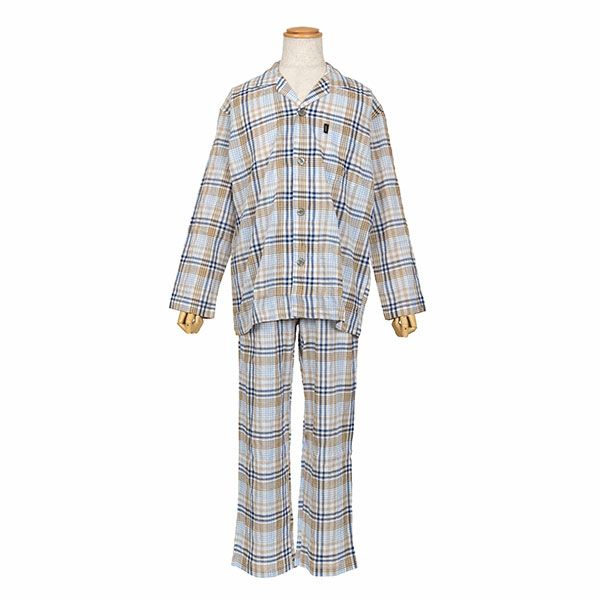 幅広い年齢層の方に着用いただける、チェック柄パジャマです。ブルー・ブラウンの2色展開です。シャツタイプのベーシックなデザインです。胸元のポケット付き。ズボンは前開き仕様で、ウエストは締め付けを軽減する2本のゴム仕様です。素材はサラッとした肌触りの良いシャーリングを使用しています。軽くて涼しい素材なので、暑い時期におすすめです。