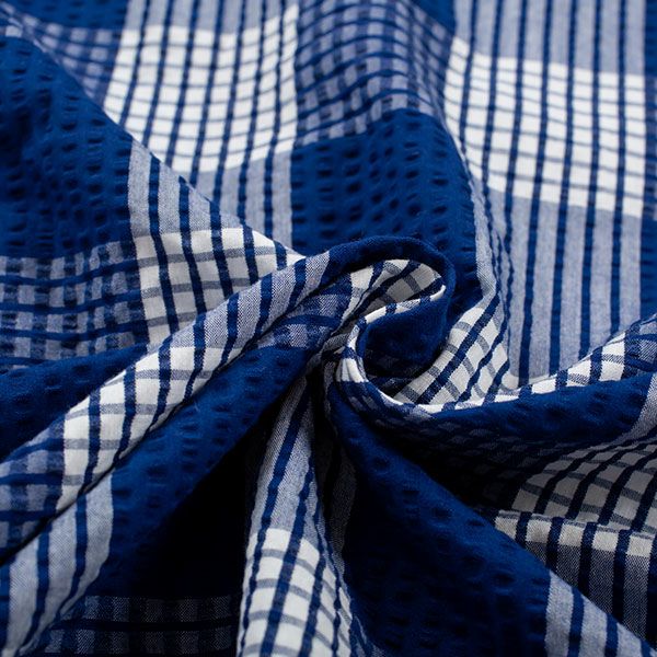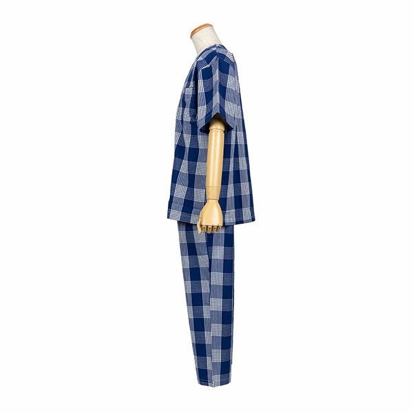 幅広い年齢層の方に着用いただける、チェック柄のパジャマです。落ち着いた色目のネイビー・ブラックの2色展開です。トップスは前開き全開の衿なし半袖スタイルです。胸元のポケット付き。ボトムは長ズボンの前開き仕様で、ウエストは締め付けを軽減する2本のゴム仕様です。素材は綿100%のさらりとした肌触りのサッカー生地を使用しています。生地の表面に凹凸があるので、肌離れが良く汗をかいてもべたつきません。蒸し暑い時期も心地よくお過ごしいただけます。