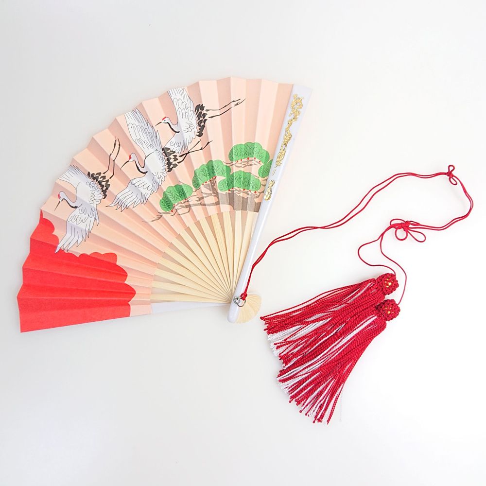 胸に挿して凛とした着姿に。親骨の部分には華やかな金彩の柄付けがされています。