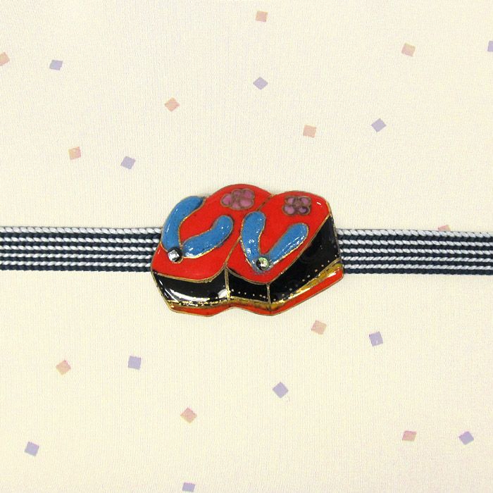 こちらは、舞子さんが履くような厚底の下駄「ぽっくり」をモチーフにしていて、季節に関係なく1年中使って頂けます。カジュアルで可愛らしい帯留ですので、普段の着物(紬や小紋)にどうぞ。