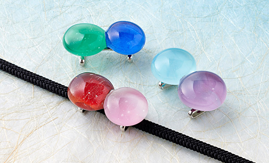 • ガラス玉の帯留シリーズは、ぽてっとした立体感のある丸型で、よく見るとひとつひとつの形が微妙に異なり、素朴な味わいを楽しめます。普段より一層涼やかで女性らしさを演出してはいかがでしょうか。