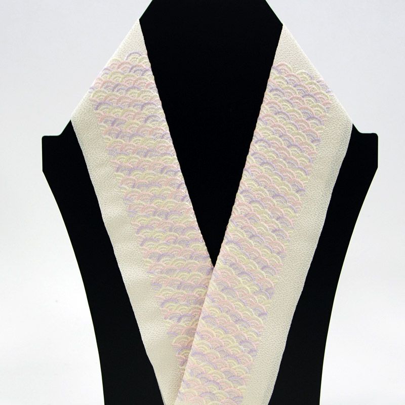 生成り地のポリエステル縮緬に、ペールカラーのピンク・パープル・イエローの青海波がぎっしり刺繍されており、ボリューム感があります。女性らしい色合いで、襟元を上品にまとめてくれます。