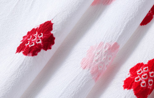 真っ白な地色に、綺麗な薄ピンクの梅の花が映えます。染め特有の鮮やかさに、絞りのふっくらとした立体感・わらかい輪郭と上品さが調和した一品です。