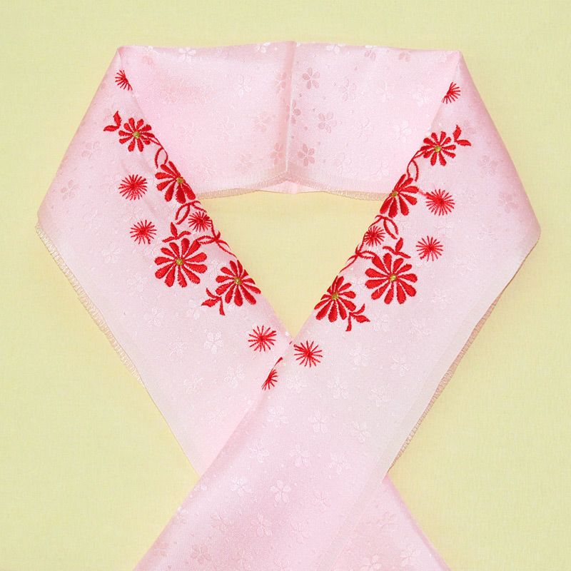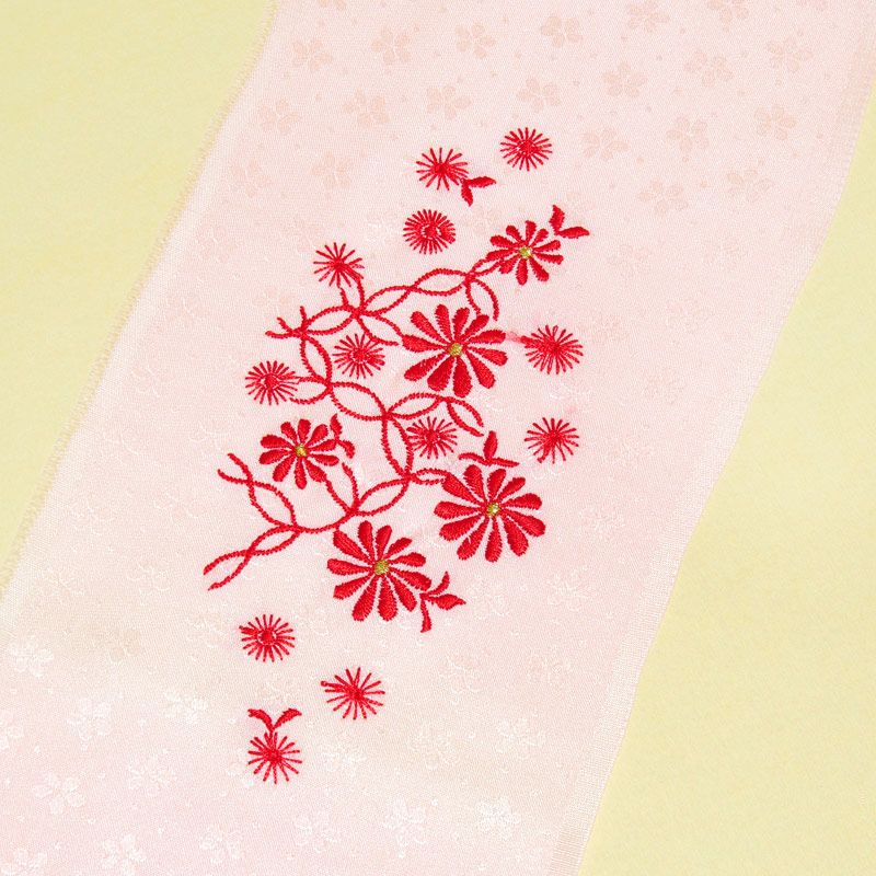 淡いピンクの正絹地に、真っ赤な刺繍が印象的です。大人用より一回り小さいサイズになります。