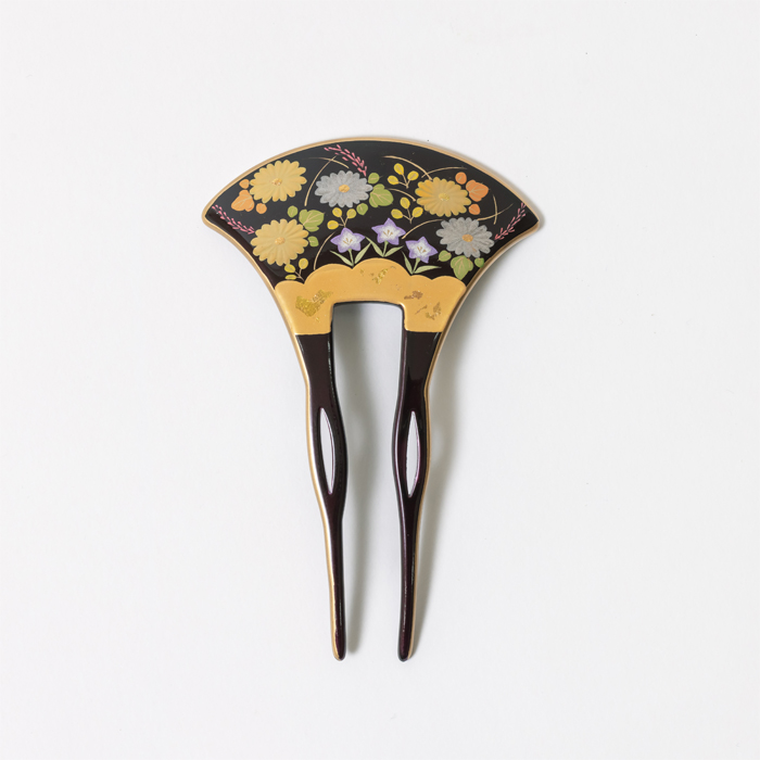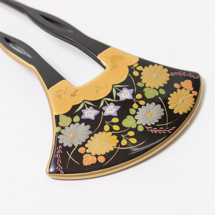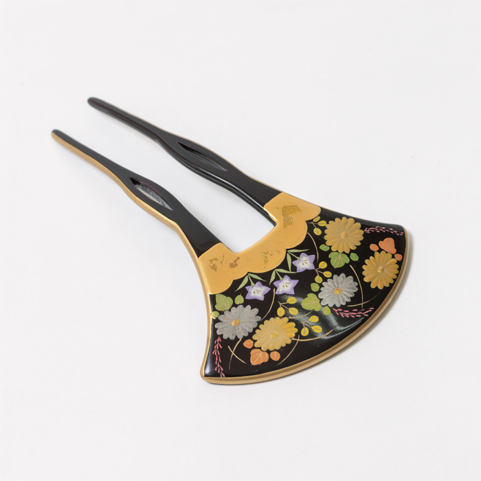 婚礼などの装いを引き立てる品格のある蒔絵で表現したかんざし 【越前塗】 蒔絵かんざし イチョウ型 菊と桔梗柄 髪飾り 簪 かんざし 銀杏型 入卒用 着物用髪飾り