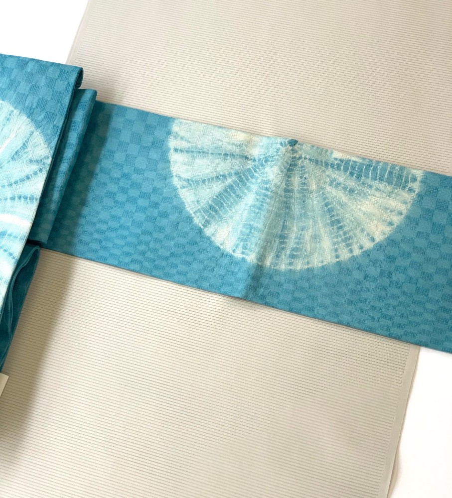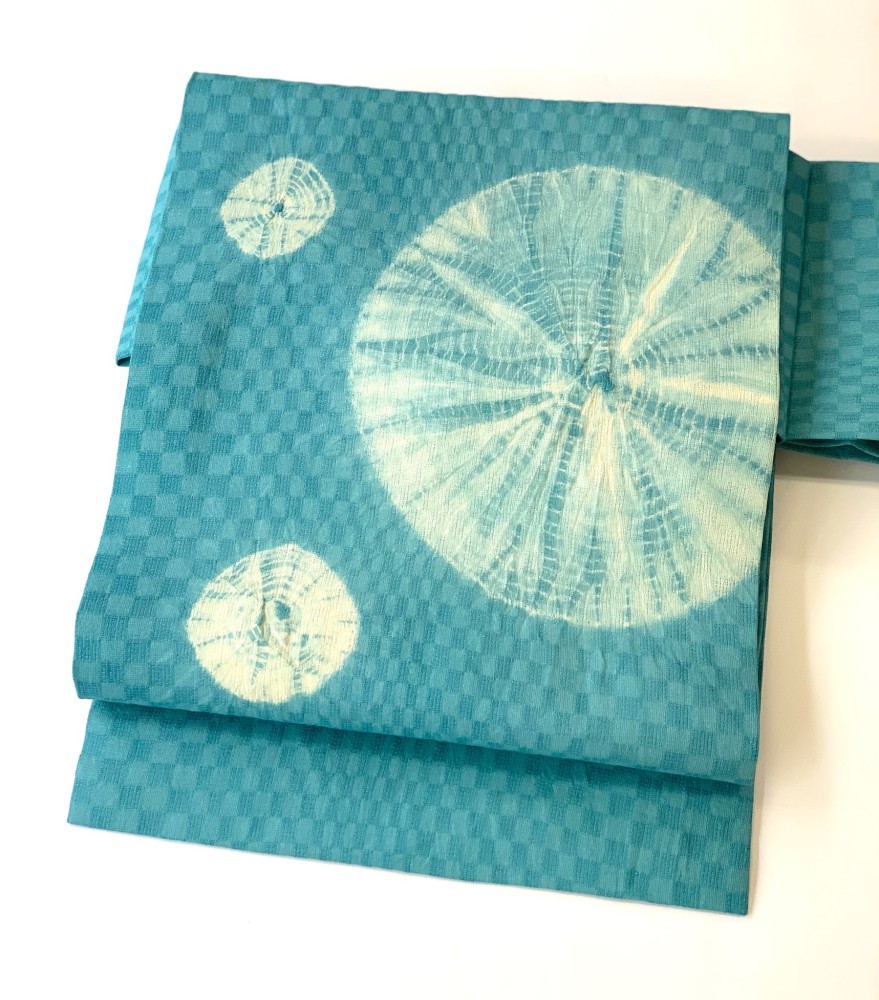 紙布で織った帯地に有松絞りのワンポイント柄 仕立て上がり名古屋帯 まるまる ミズイロ