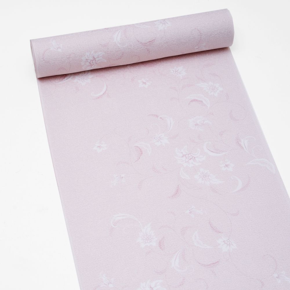 遠目には無地に見えますが、淡いピンク地に唐草模様をあしらったお召風の小紋です。