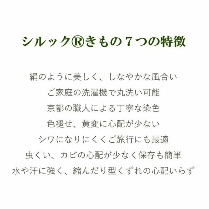 全てのシルックRきものには、シルラックR加工という特殊な加工による静電気の防止機能があります。洗濯しても効果は長持ち、効果の低下を感じたらアイロンをかけることで復元できます。