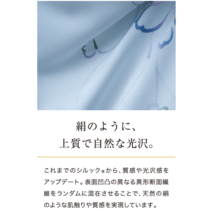 しなやかさと美しさの秘密は、絹と同じような多角形の断面にあります。これにより、上品で美しい光沢、シャリ感のある感触、優雅なドレープ性を表現しています。